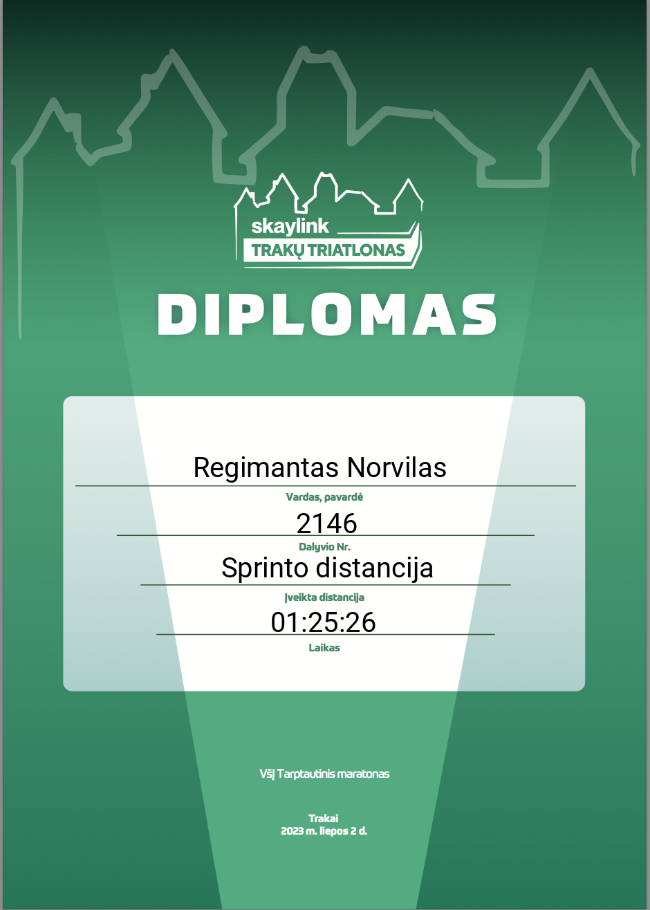 | 84 | Regimantas Norvilas | Klaipėdos triatlono klubas | 2146 | Lithuania | Sprinto distancija | 01:25:26 | Diplomas |