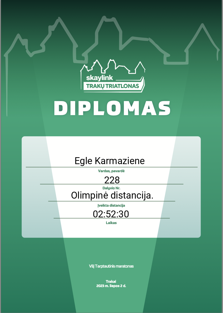 | 138 | Gerda Klimaitė | Love Streams Running | 78 | Lithuania | Olimpinė distancija. | 02:53:51 | Diplomas |