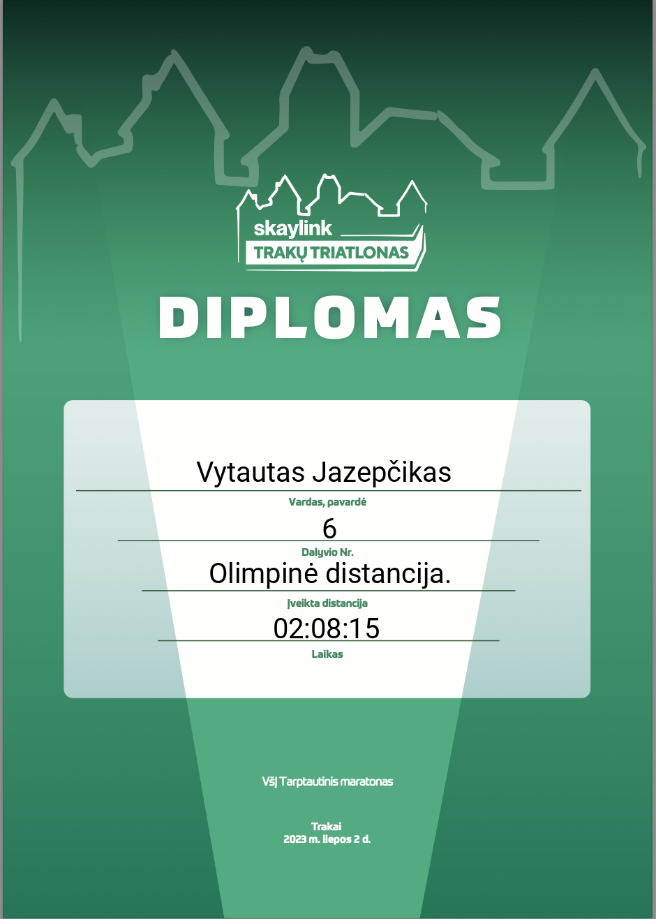 8 Vytautas Jazepčikas TRItonas 6 Lithuania Olimpinė distancija. 02:08:15 00:25:04 00:00:36 01:03:26 00:09:31 00:09:39 00:09:43 00:00:39 00:38:30 00:09:38 Diplomas