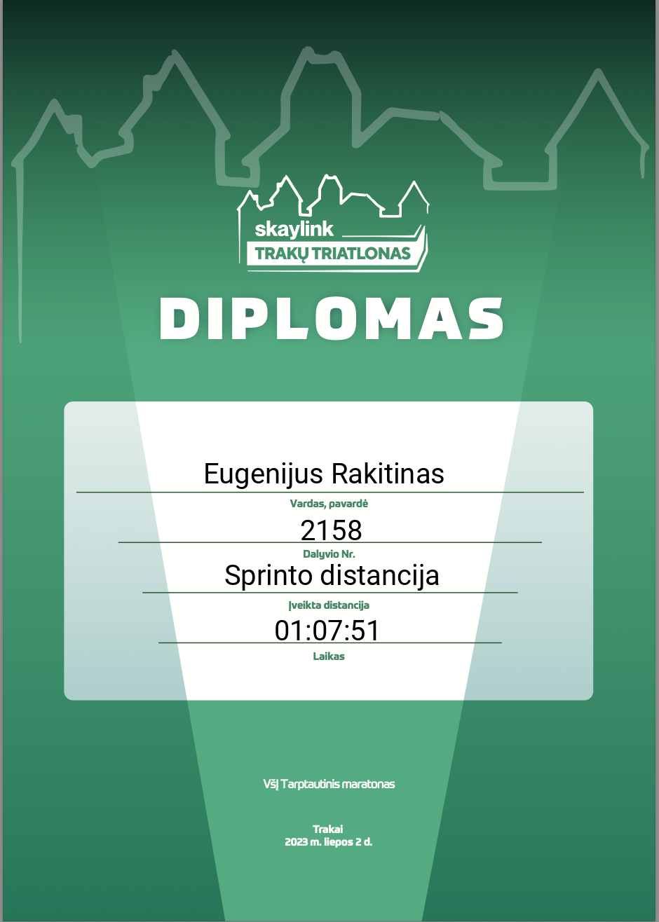 8 Eugenijus Rakitinas Aukštaitijos plaukimo-triatlono akademija 2158 Lithuania Sprinto distancija 01:07:51 00:10:33 00:00:44 00:35:05 00:10:35 00:10:15 00:00:39 00:20:50 Diplomas