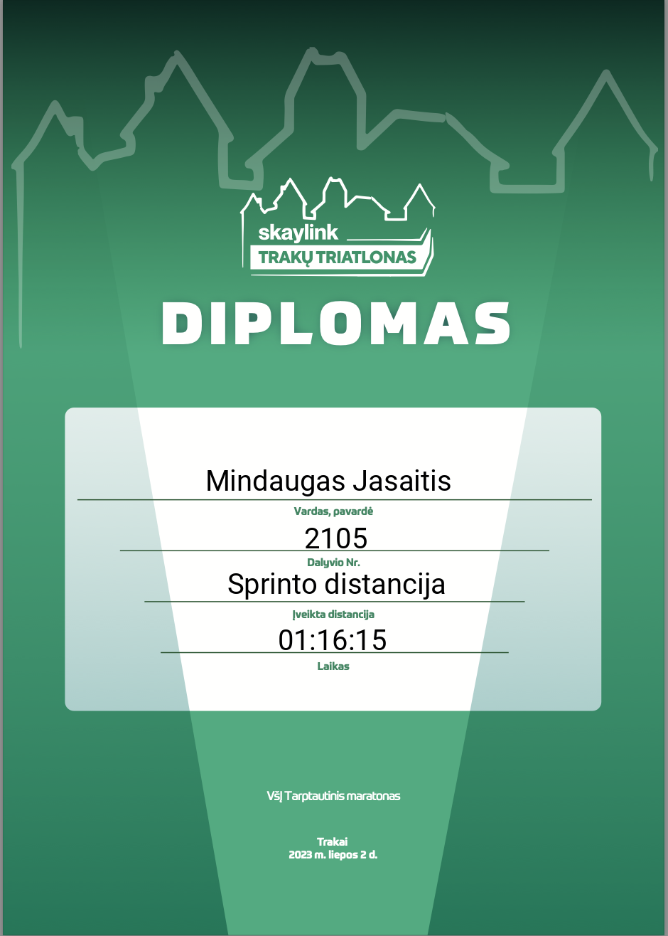 | 30 | Mantas Zubavičius | Klaipėdos Triatlono Klubas | 2072 | Lithuania | Sprinto distancija | 01:16:14 | Diplomas |