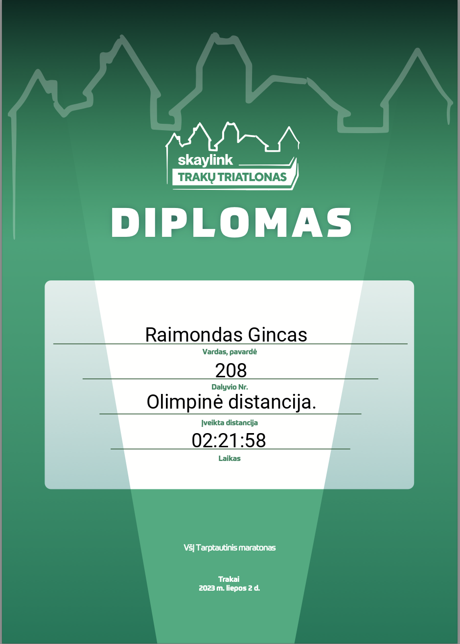 | 29 | Andrius Ogintas | Klaipėdos triatlono klubas | 38 | Lithuania | Olimpinė distancija. | 02:20:12 | Diplomas |