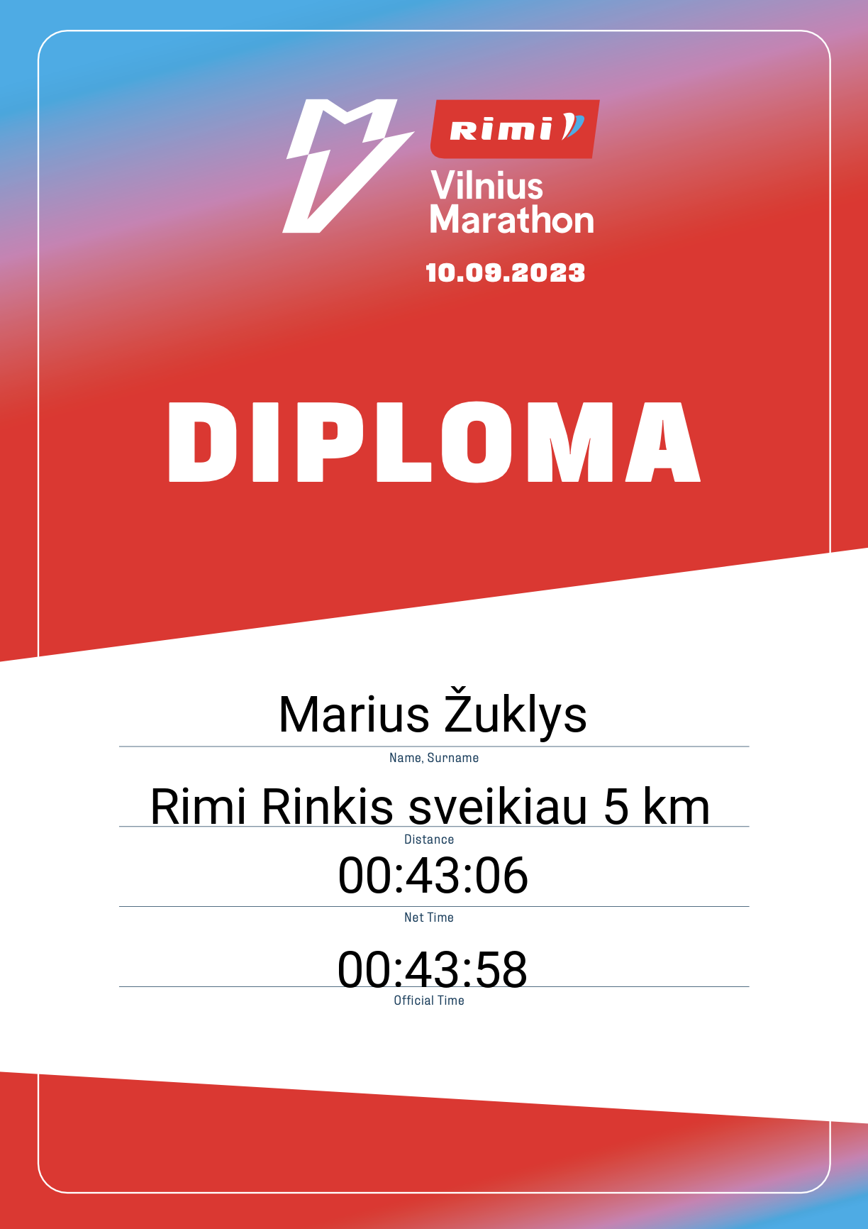 | 2366 | Marius Žuklys | Žukliai | 30021 | Lithuania | Rimi Rinkis sveikiau 5 km | 00:43:58 | Diplomas |