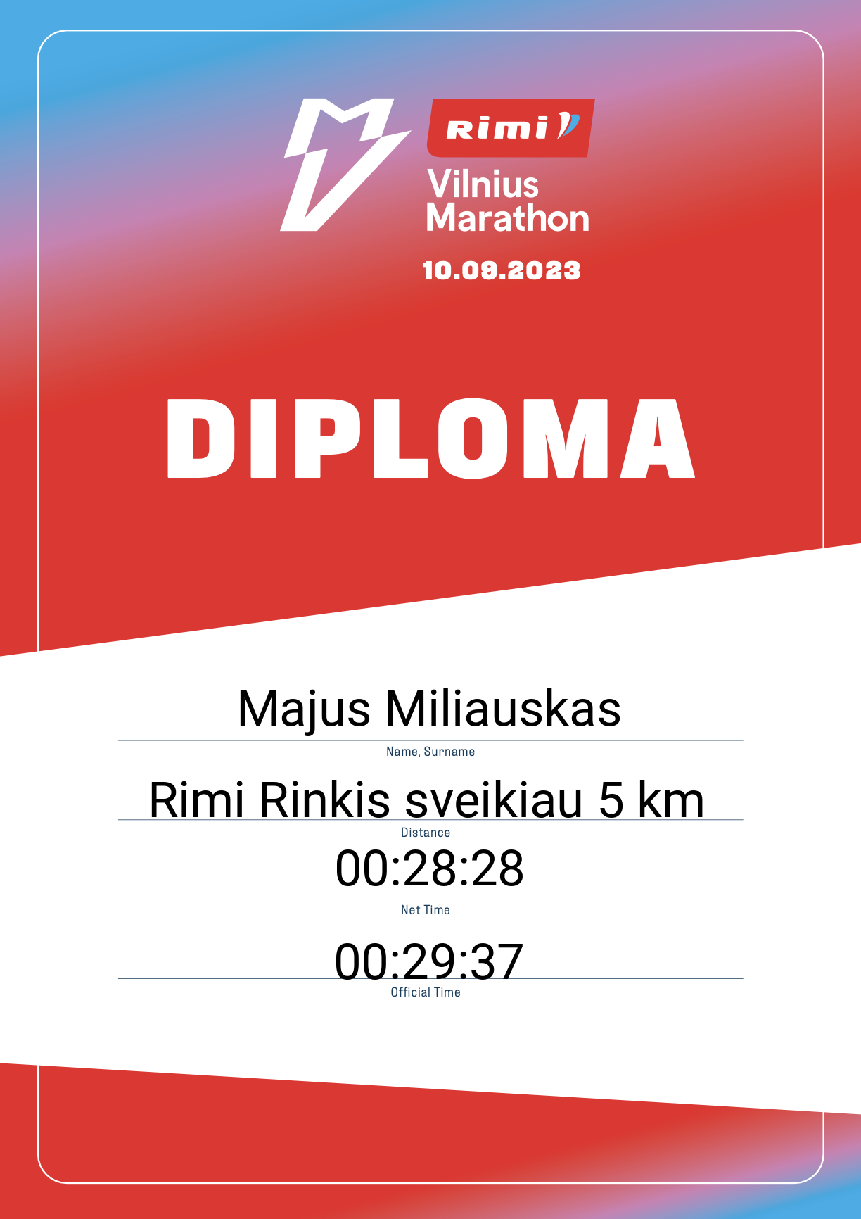 | 688 | Majus Miliauskas | SOSTINĖS SPORTO CENTRAS | 32794 | Lithuania | Rimi Rinkis sveikiau 5 km | 00:29:37 | Diplomas |