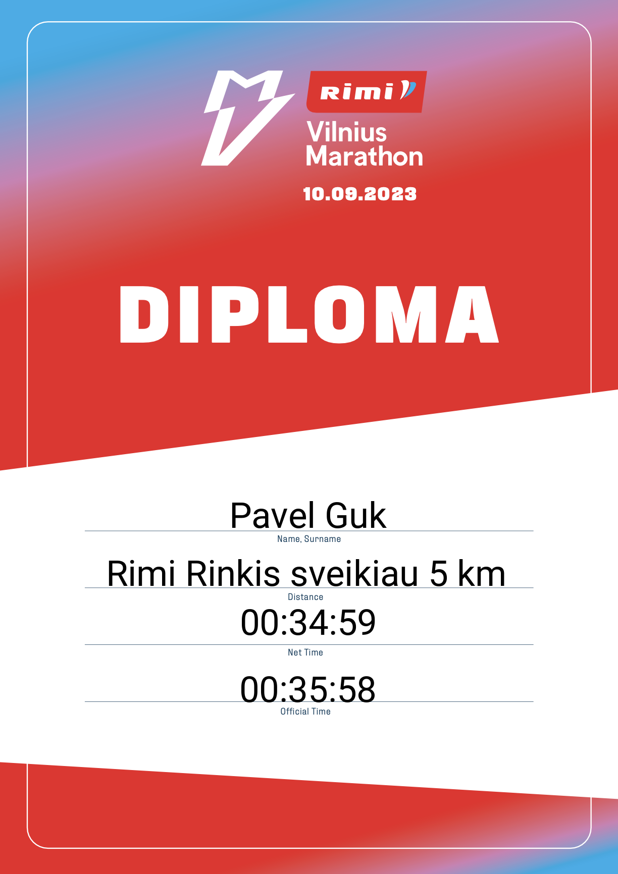 | 1581 | Pavel Guk | SOSTINĖS SPORTO CENTRAS | 32806 | Lithuania | Rimi Rinkis sveikiau 5 km | 00:35:58 | Diplomas |