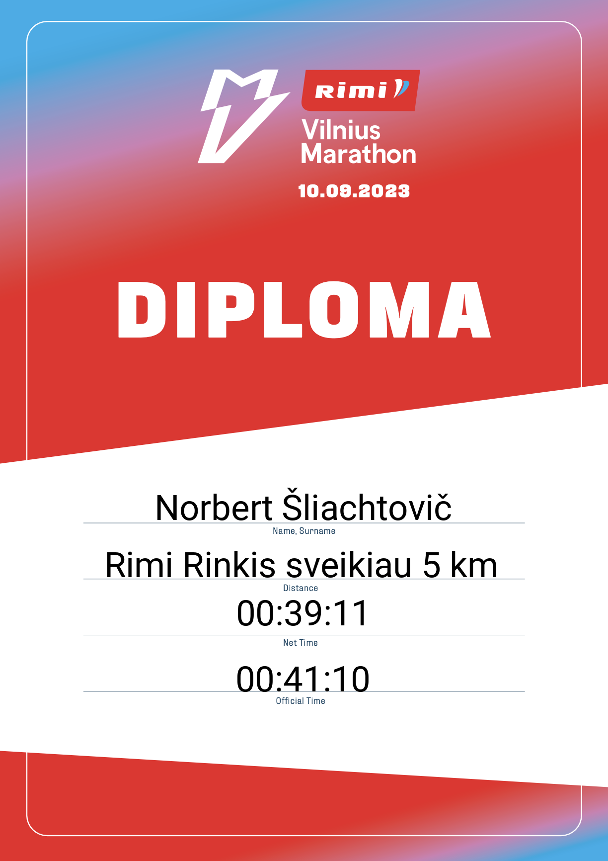 | 2170 | Norbert Šliachtovič | 33438 | Lithuania | Rimi Rinkis sveikiau 5 km | 00:41:10 | Diplomas | |