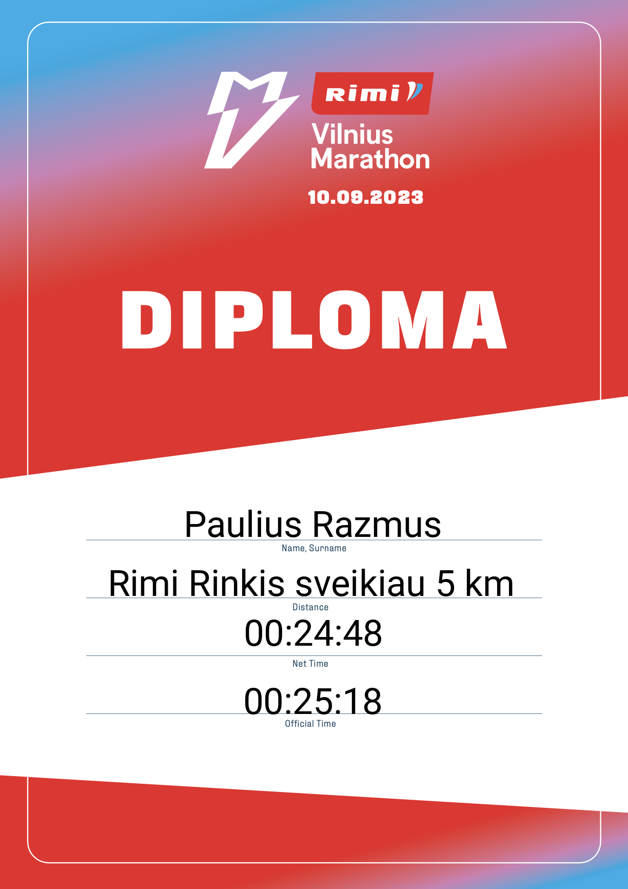 | 269 | Paulius Razmus | 30390 | Lithuania | Rimi Rinkis sveikiau 5 km | 00:25:18 | Diplomas | |