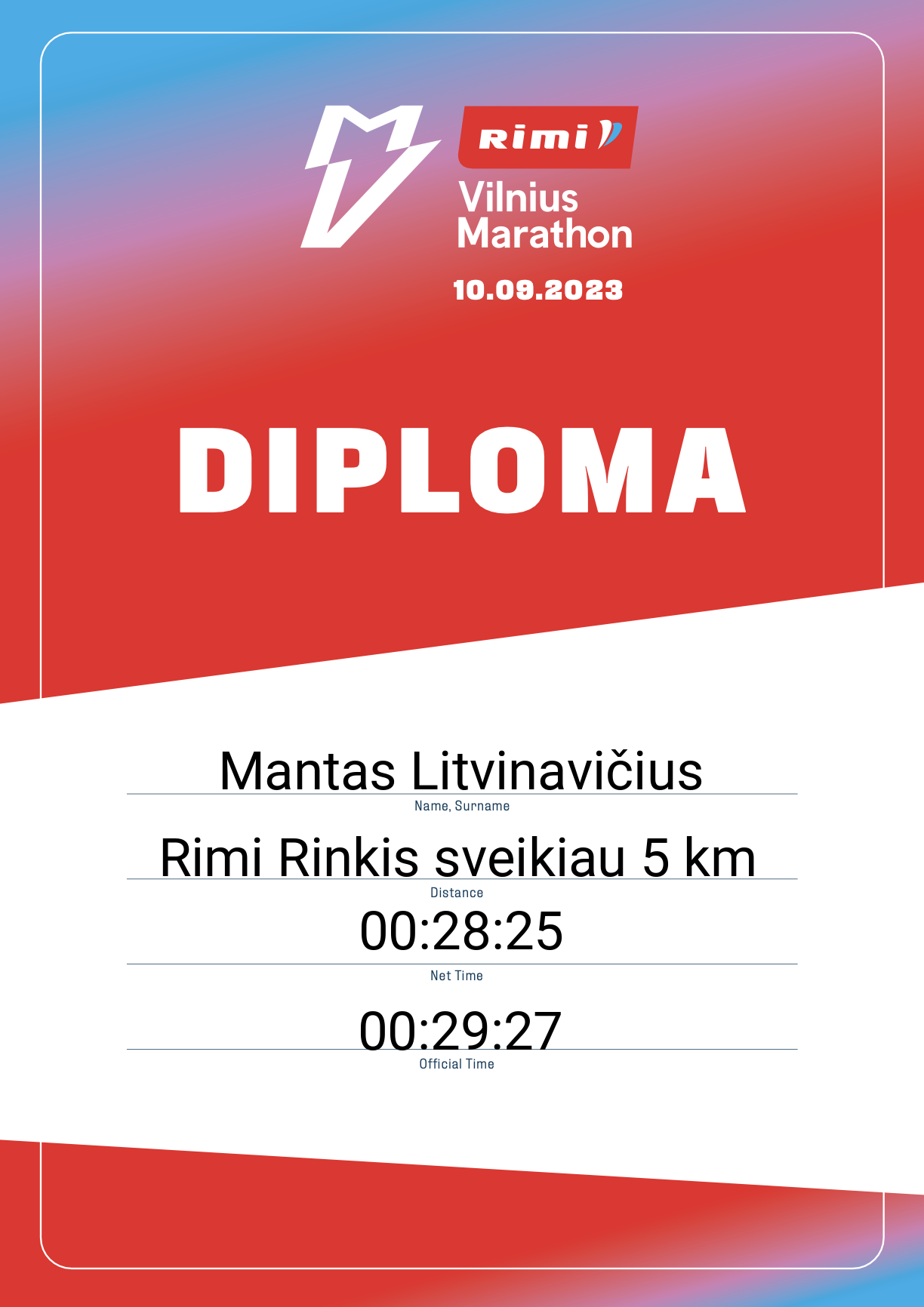 | 667 | Mantas Litvinavičius | 30383 | Lithuania | Rimi Rinkis sveikiau 5 km | 00:29:27 | Diplomas | |