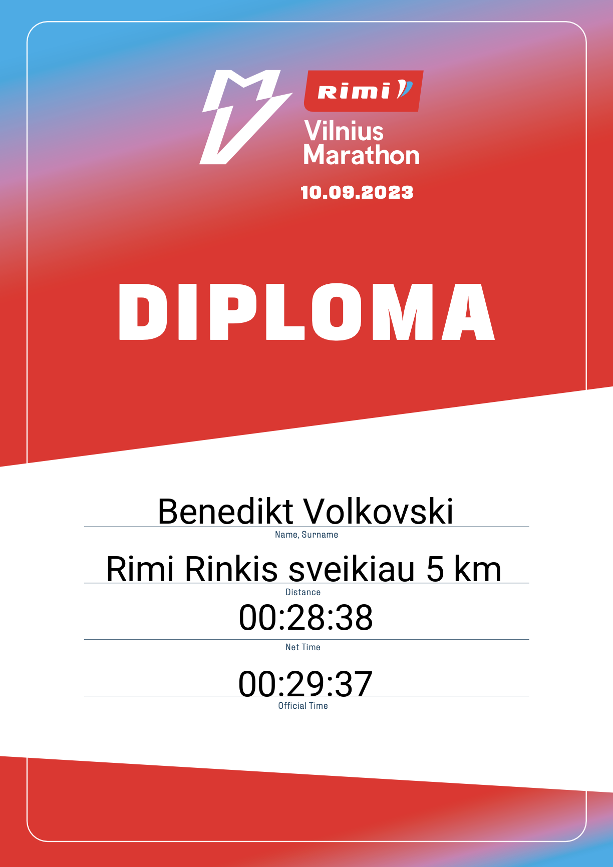 | 686 | Benedikt Volkovski | 30387 | Lithuania | Rimi Rinkis sveikiau 5 km | 00:29:37 | Diplomas | |