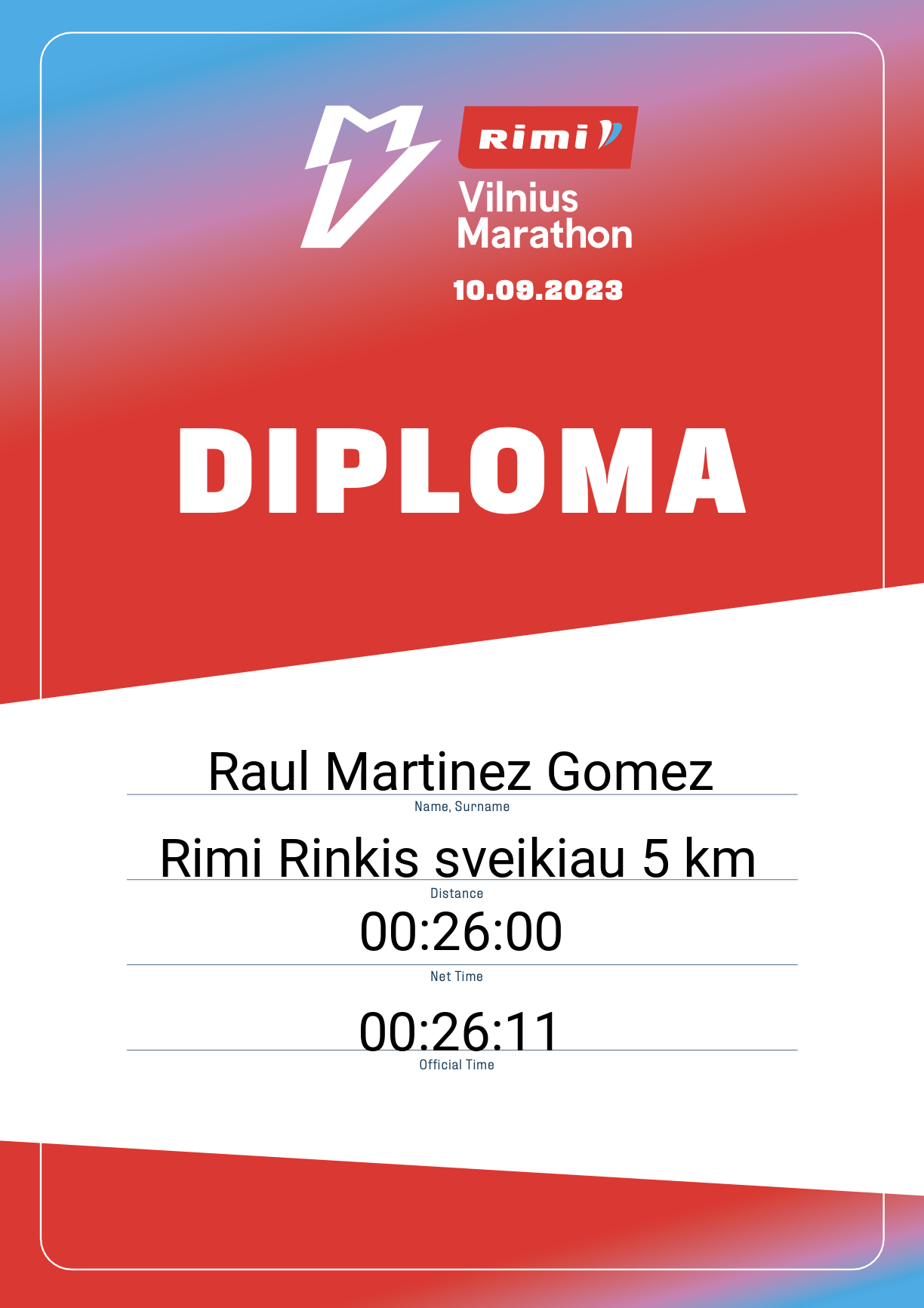 | 330 | Raul Martinez Gomez | Yara Lietuva | 30462 | Lithuania | Rimi Rinkis sveikiau 5 km | 00:26:11 | Diplomas |