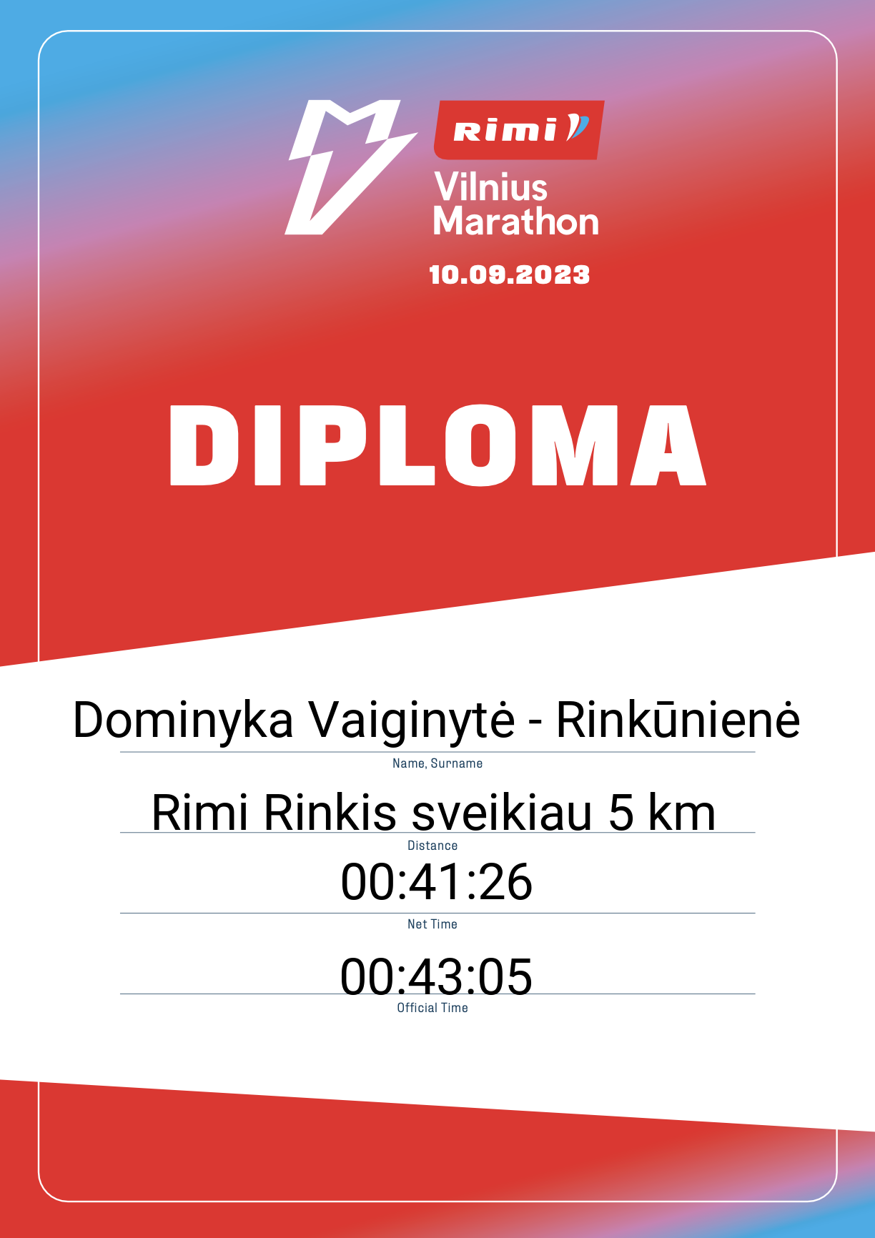 | 2310 | Dominyka Vaiginytė - Rinkūnienė | Nasdaq | 30975 | Lithuania | Rimi Rinkis sveikiau 5 km | 00:43:05 | Diplomas |