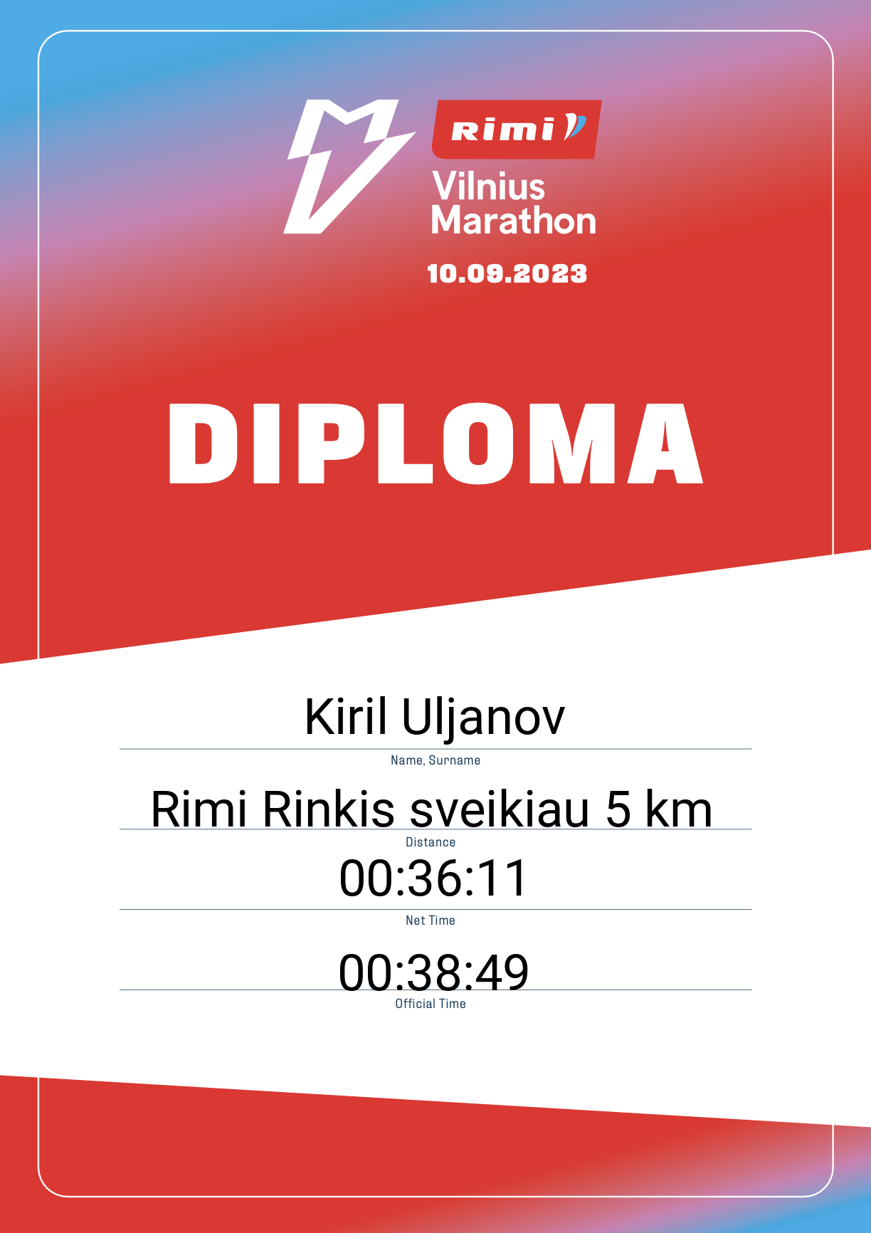 | 1931 | Ernestas Oržekauskas | 33487 | Lithuania | Rimi Rinkis sveikiau 5 km | 00:38:36 | Diplomas | |