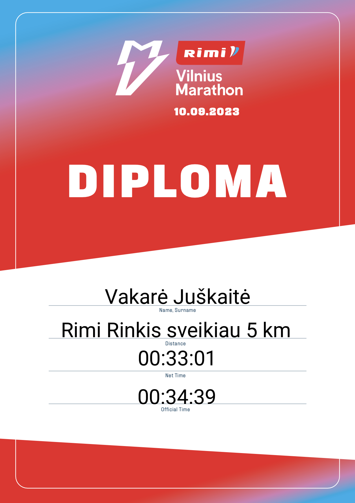 | 1387 | Vakarė Juškaitė | F.O.C.U.S. running | 31483 | Lithuania | Rimi Rinkis sveikiau 5 km | 00:34:39 | Diplomas |
