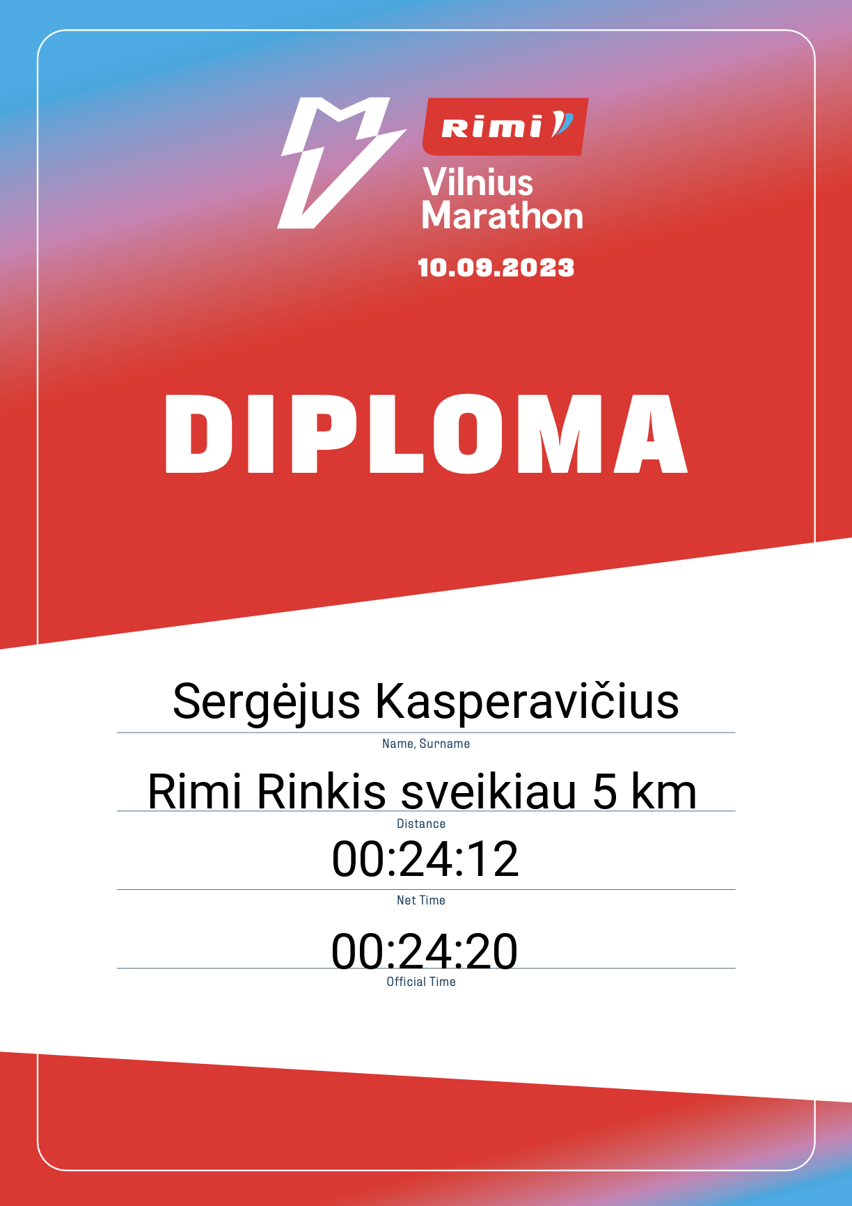 | 209 | Sergėjus Kasperavičius | Begimo klubas | 30147 | Lithuania | Rimi Rinkis sveikiau 5 km | 00:24:20 | Diplomas |