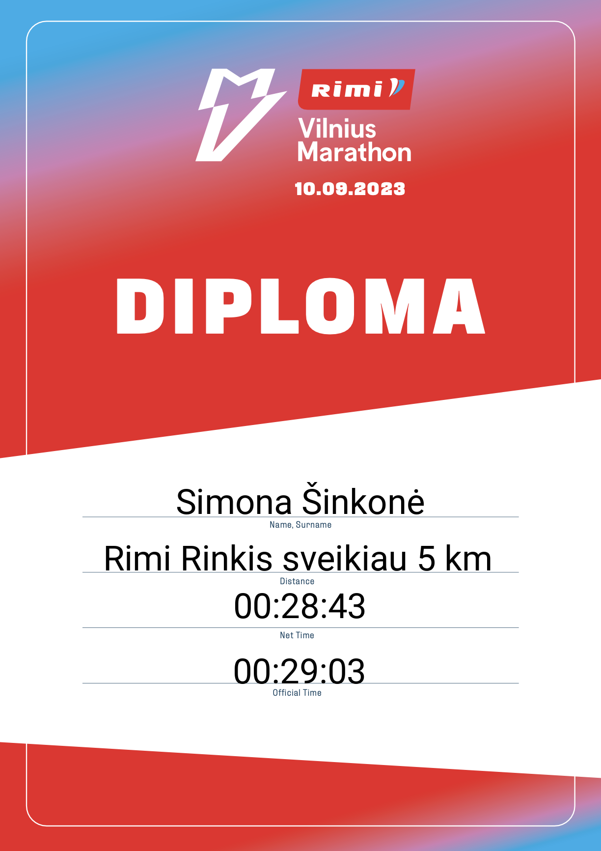 | 611 | Simona Šinkonė | 30153 | Lithuania | Rimi Rinkis sveikiau 5 km | 00:29:03 | Diplomas | |