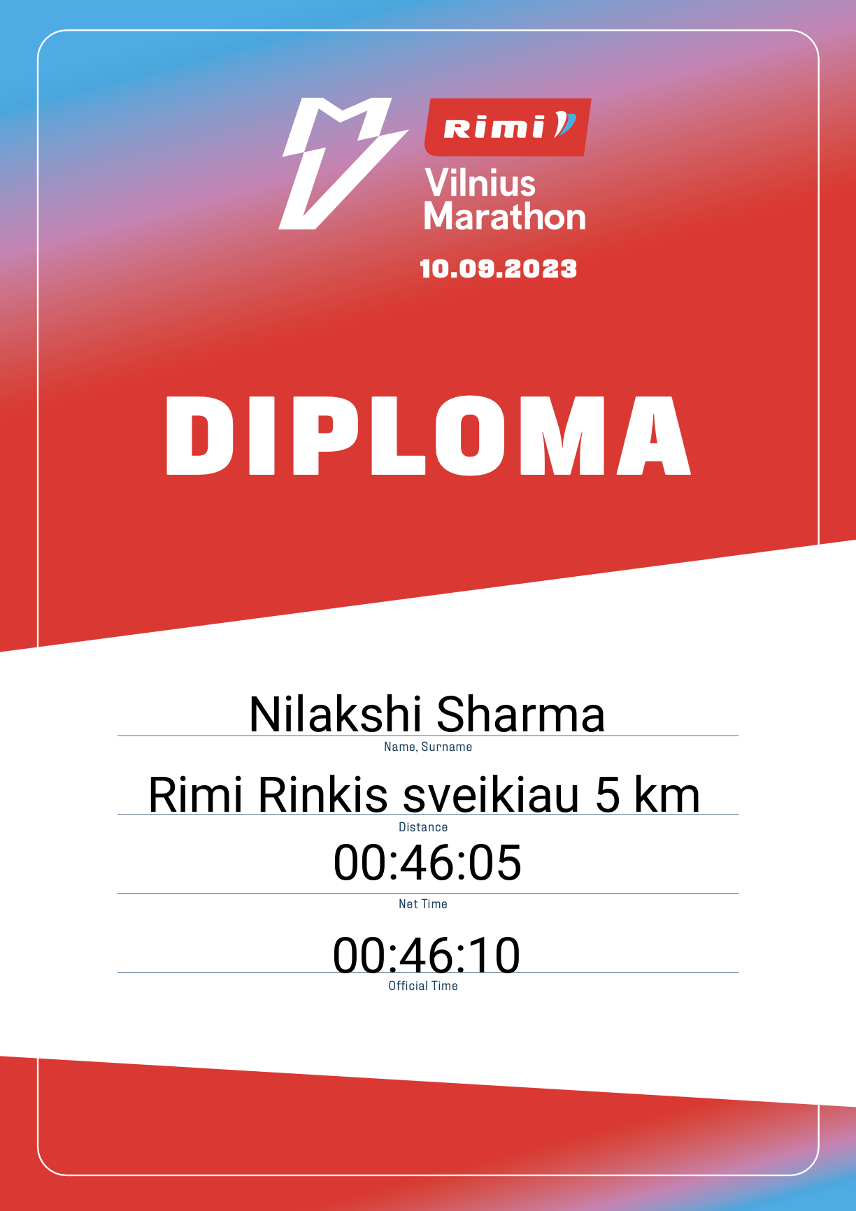 | 2438 | Nilakshi Sharma | SEB | 31829 | Lithuania | Rimi Rinkis sveikiau 5 km | 00:46:10 | Diplomas |