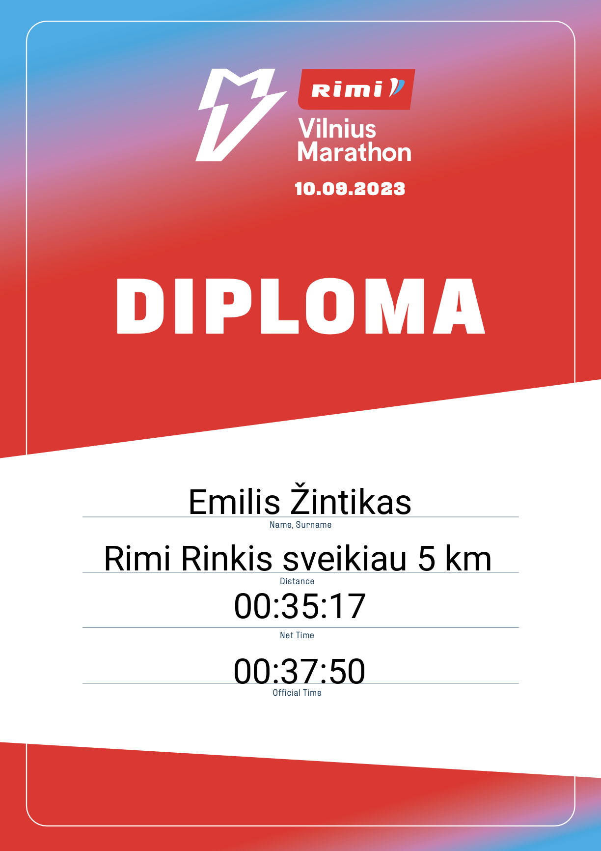 | 1823 | Emilis Žintikas | FA Benfica-Ateitis | 31853 | Lithuania | Rimi Rinkis sveikiau 5 km | 00:37:50 | Diplomas |