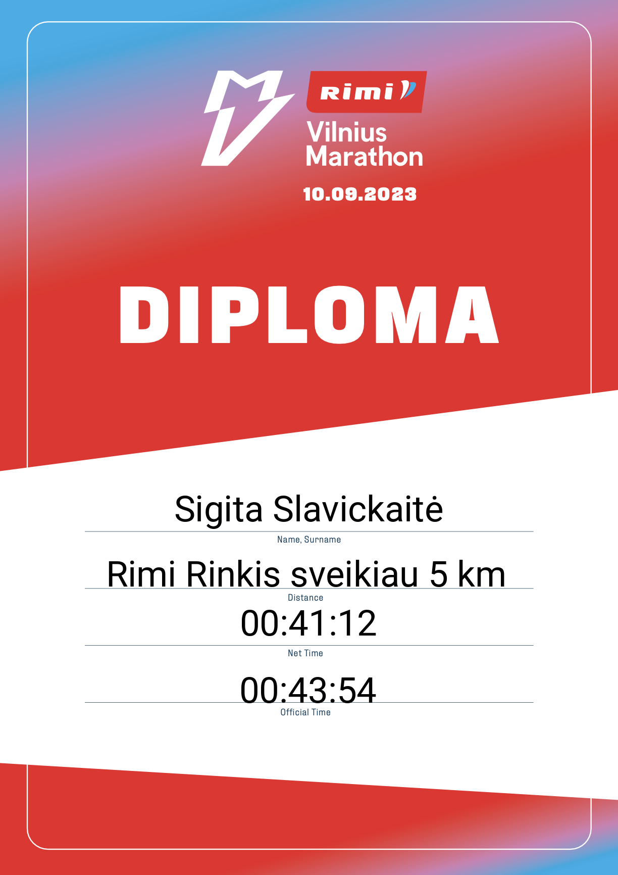 | 2359 | Sigita Slavickaitė | Tesonet | 31995 | Lithuania | Rimi Rinkis sveikiau 5 km | 00:43:54 | Diplomas |
