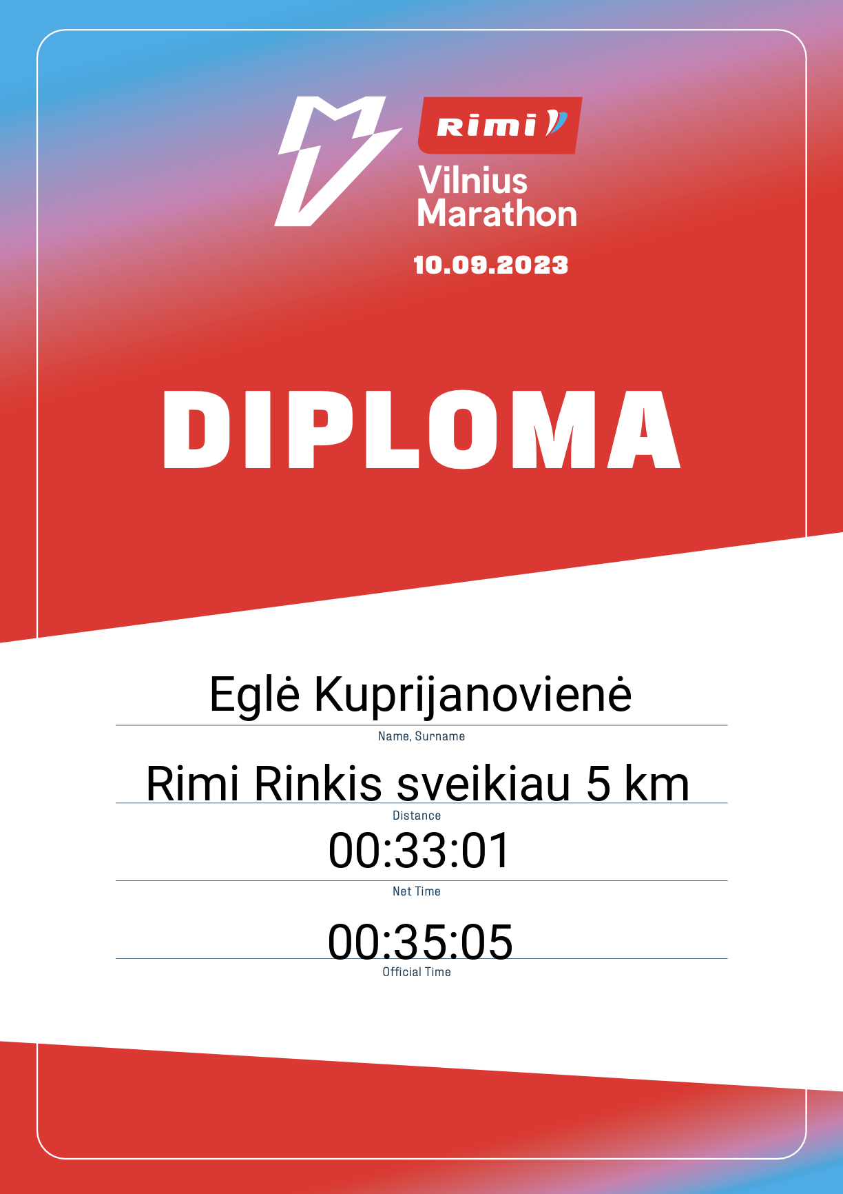 | 1346 | Miglė Mineikytė | Erasmus+ | 32306 | Lithuania | Rimi Rinkis sveikiau 5 km | 00:34:23 | Diplomas |