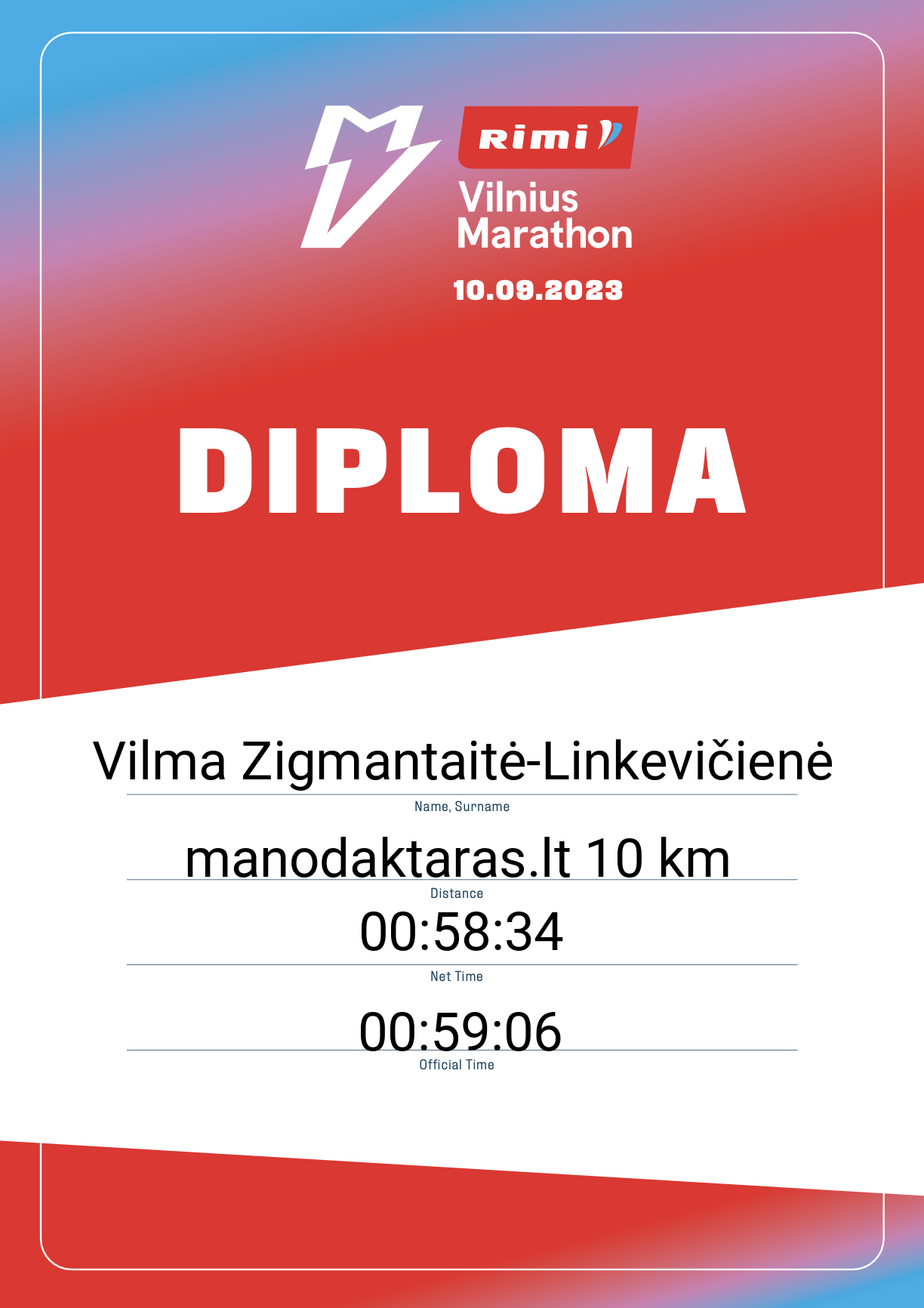 | 925 | Vilma Zigmantaitė-Linkevičienė | Mano bankas | 20953 | Lithuania | manodaktaras.lt 10 km | 00:59:06 | Diplomas |