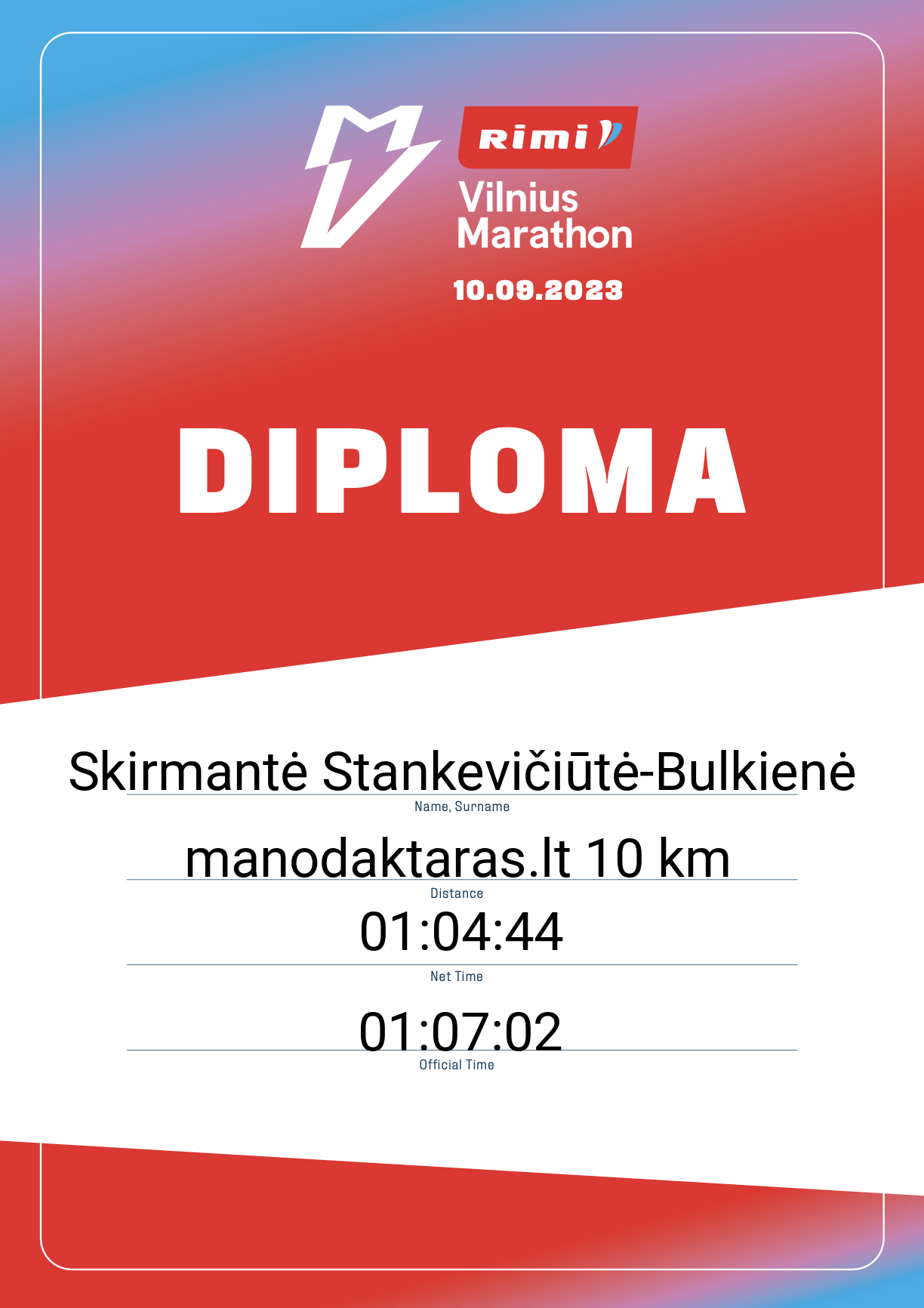 | 1519 | Skirmantė Stankevičiūtė-Bulkienė | DB Schenker LT | 20977 | Lithuania | manodaktaras.lt 10 km | 01:07:02 | Diplomas |