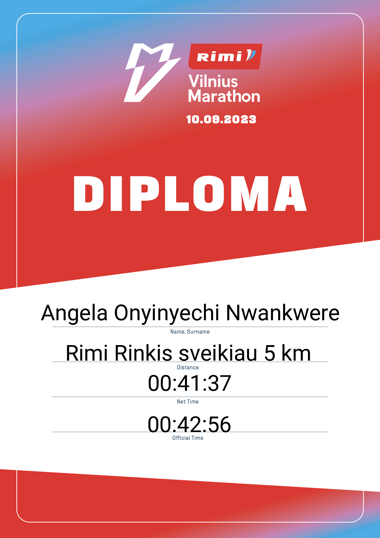 | 2304 | Angela Onyinyechi Nwankwere | 33038 | Afghanistan | Rimi Rinkis sveikiau 5 km | 00:42:56 | Diplomas | |