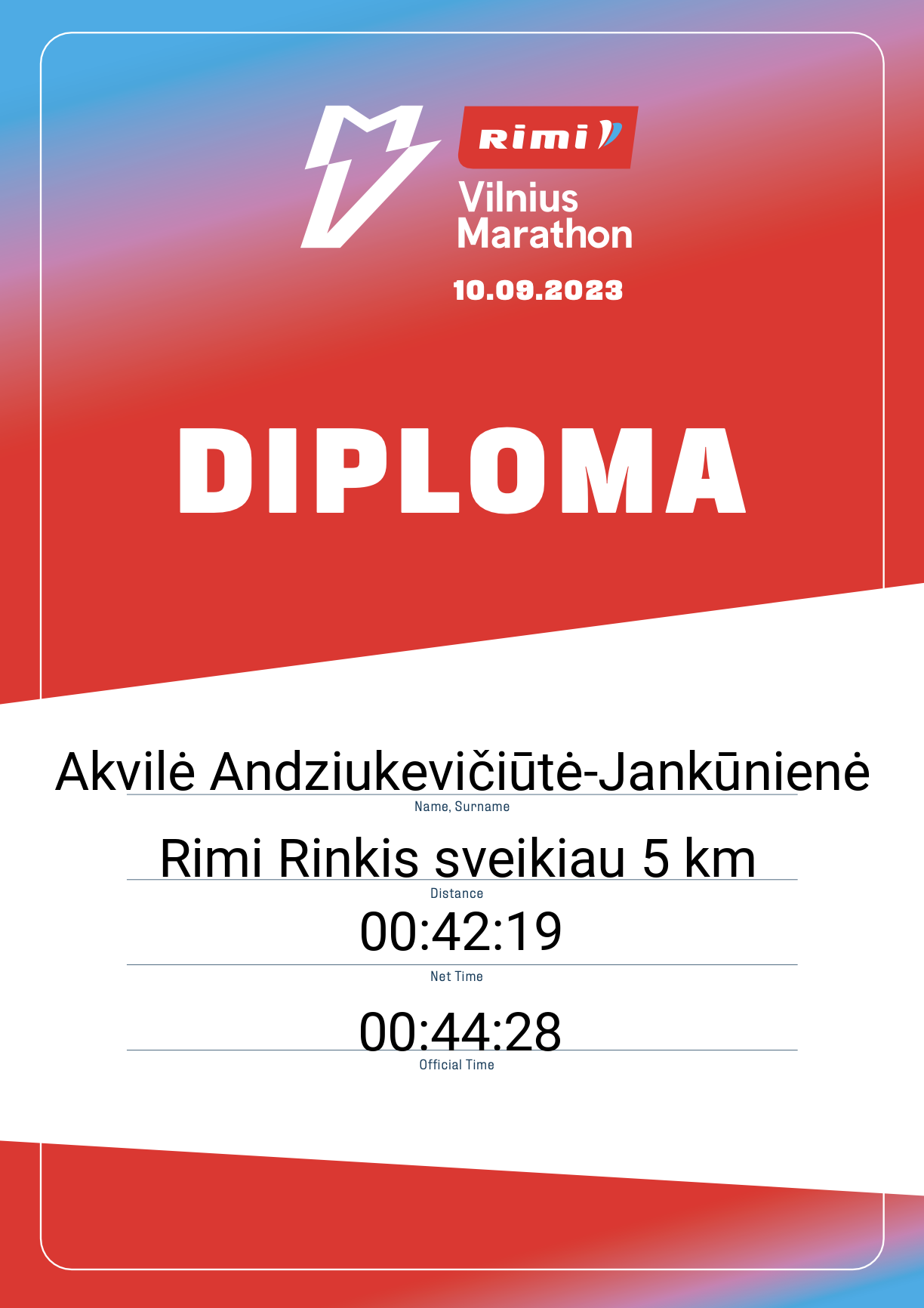 | 2396 | Akvilė Andziukevičiūtė-Jankūnienė | Erasmus+ | 32273 | Lithuania | Rimi Rinkis sveikiau 5 km | 00:44:28 | Diplomas |