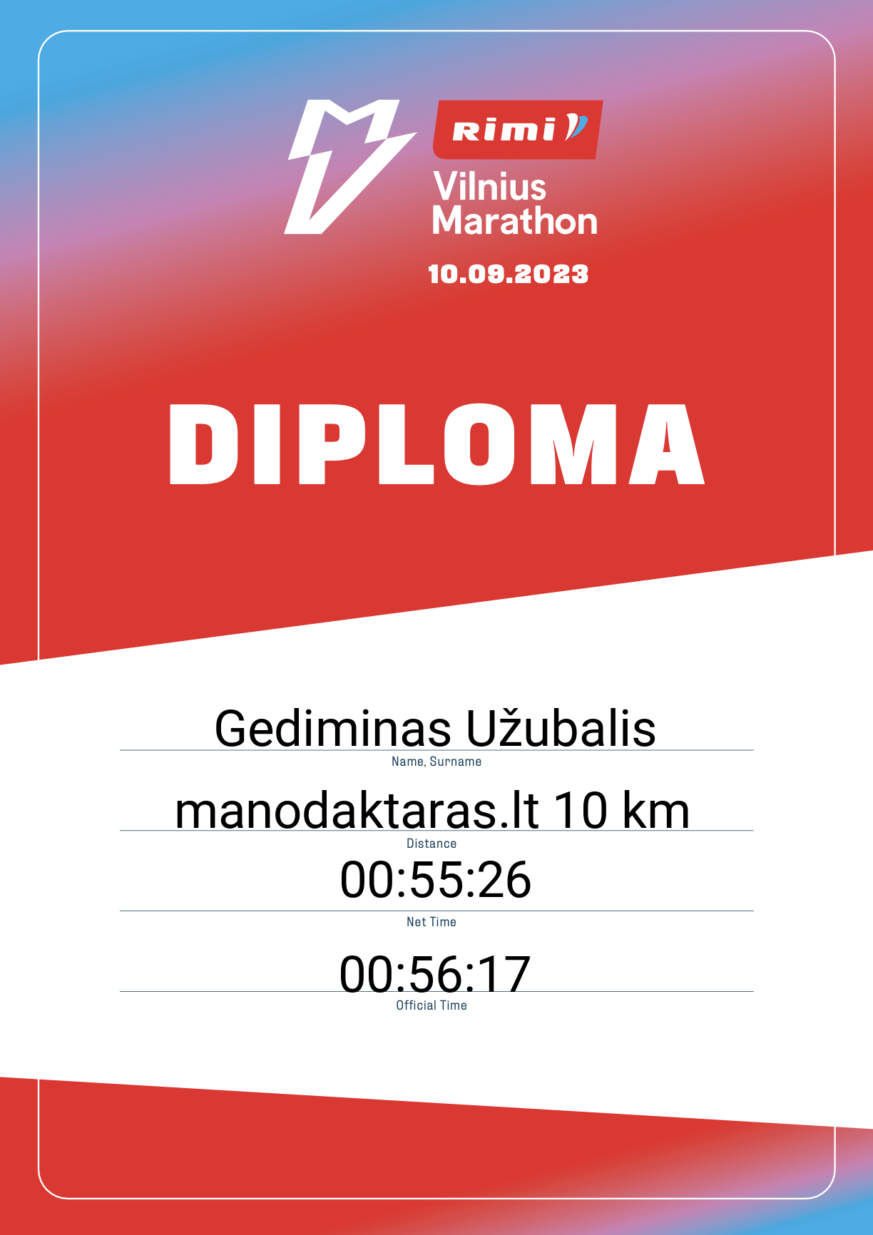 | 663 | Gediminas Užubalis | LRTA | 22688 | Lithuania | manodaktaras.lt 10 km | 00:56:17 | Diplomas |