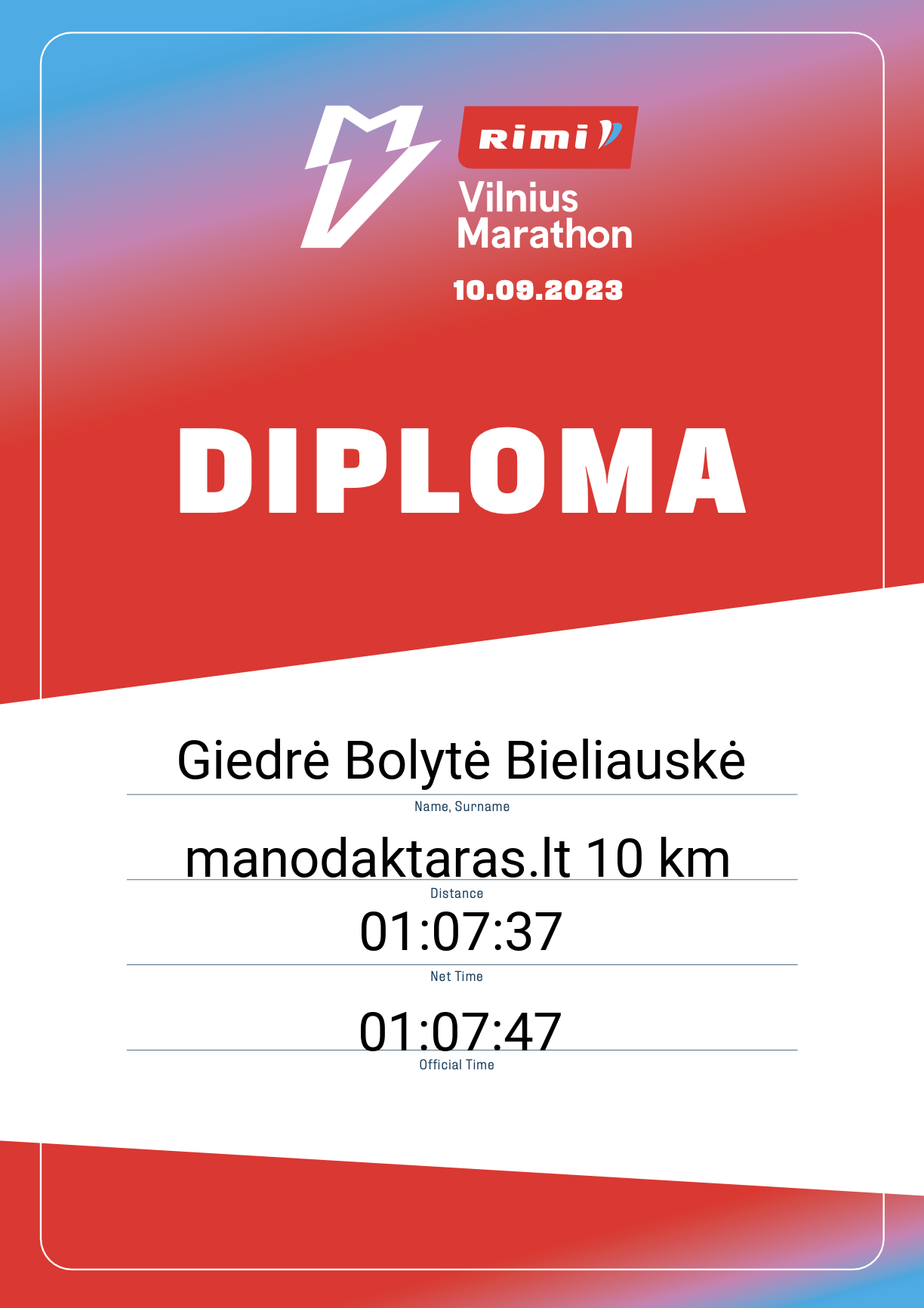 | 1560 | Giedrė Bolytė Bieliauskė | Baltic Amadeus | 22320 | Lithuania | manodaktaras.lt 10 km | 01:07:47 | Diplomas |