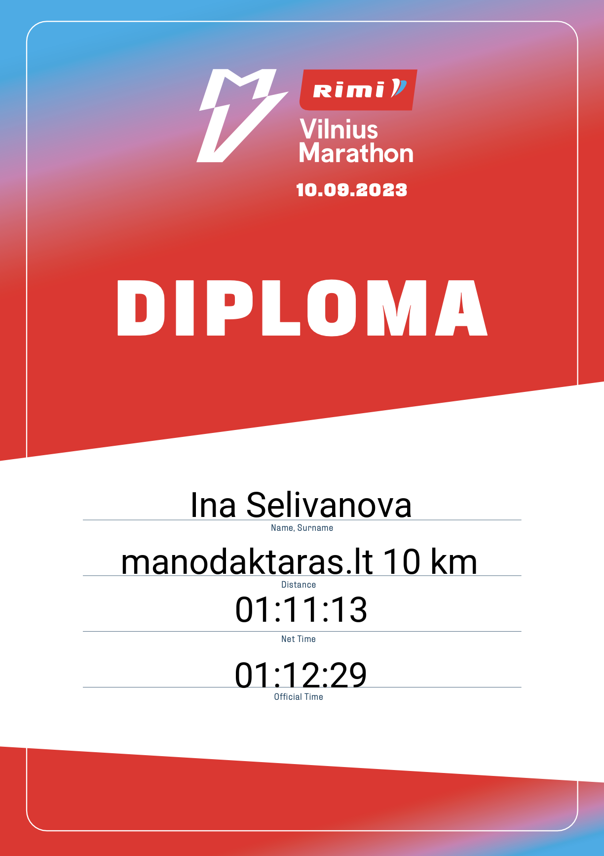 | 1792 | Ina Selivanova | RunStudio Vilnius | 21015 | Lithuania | manodaktaras.lt 10 km | 01:12:29 | Diplomas |