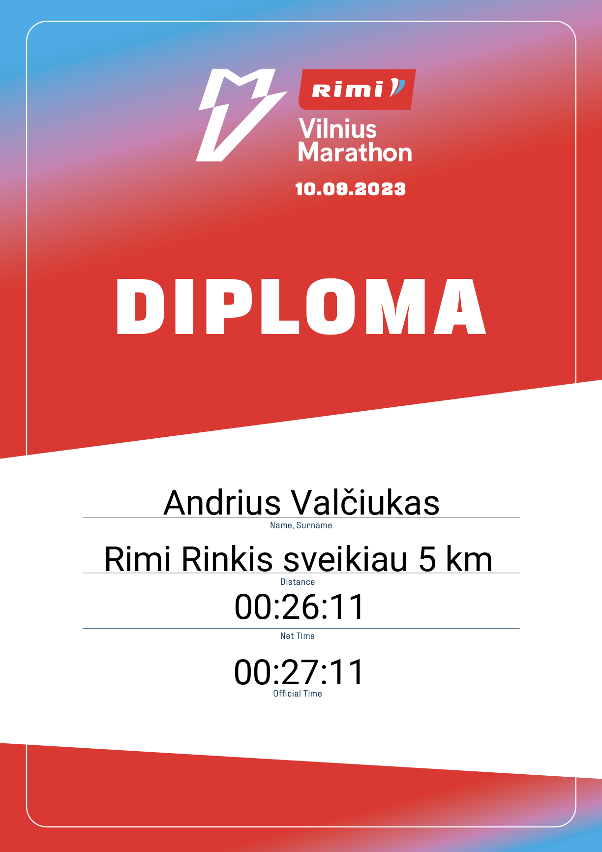 | 417 | Andrius Valčiukas | 33061 | Lithuania | Rimi Rinkis sveikiau 5 km | 00:27:11 | Diplomas | |