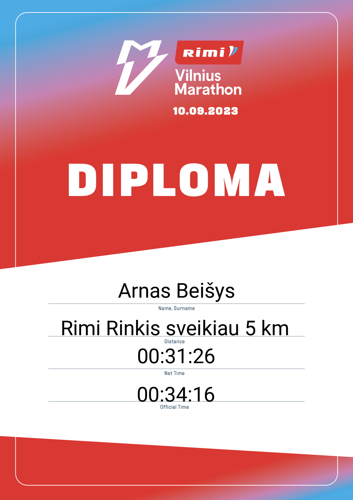 | 1322 | Arnas Beišys | - | 32059 | Lithuania | Rimi Rinkis sveikiau 5 km | 00:34:16 | Diplomas |