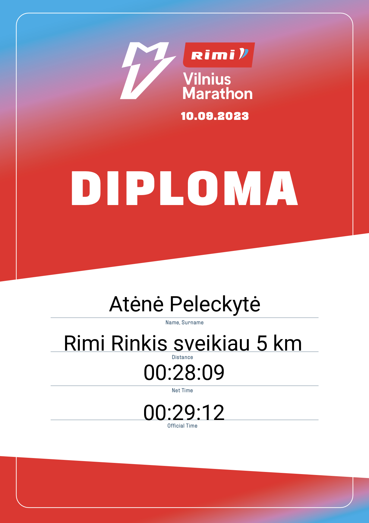 | 910 | Atėnė Rinkūnaitė | SOSTINĖS SPORTO CENTRAS | 32768 | Lithuania | Rimi Rinkis sveikiau 5 km | 00:31:22 | Diplomas |