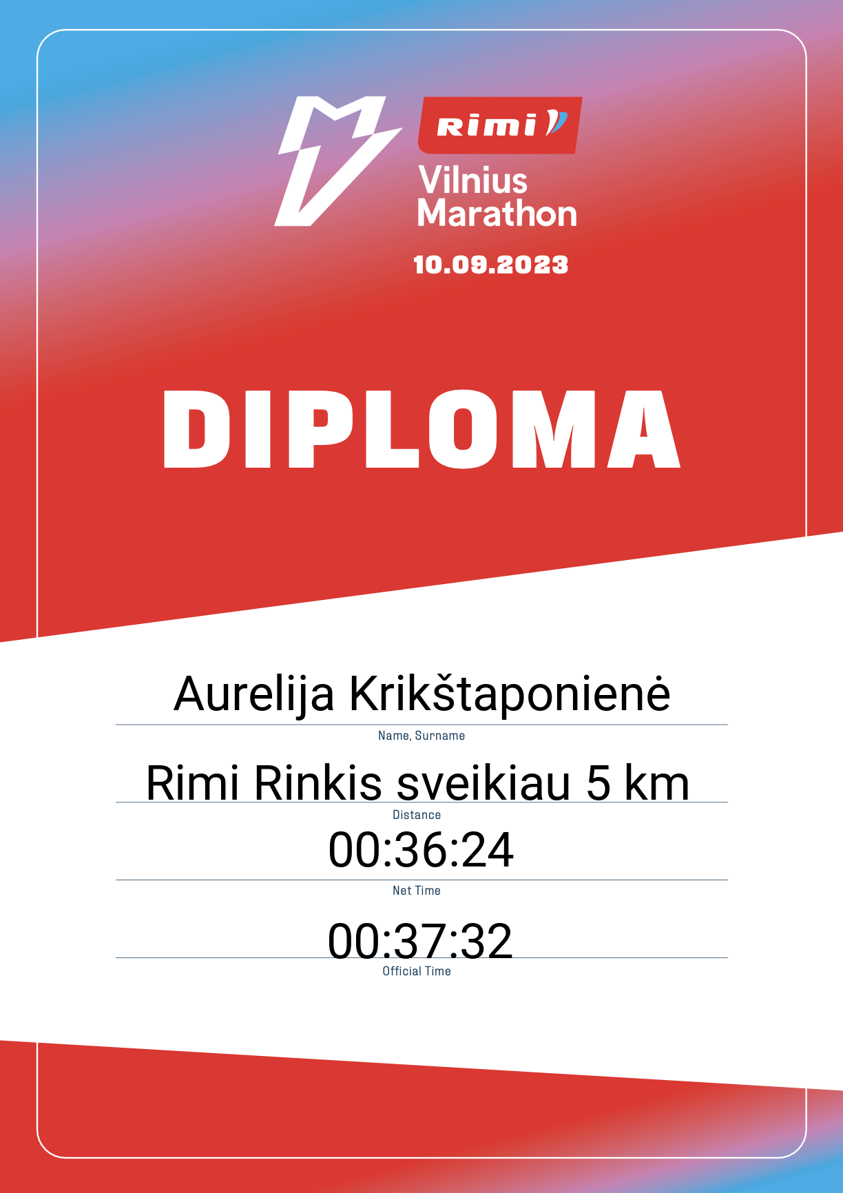 | 1783 | Aurelija Krikštaponienė | 31308 | Lithuania | Rimi Rinkis sveikiau 5 km | 00:37:32 | Diplomas | |