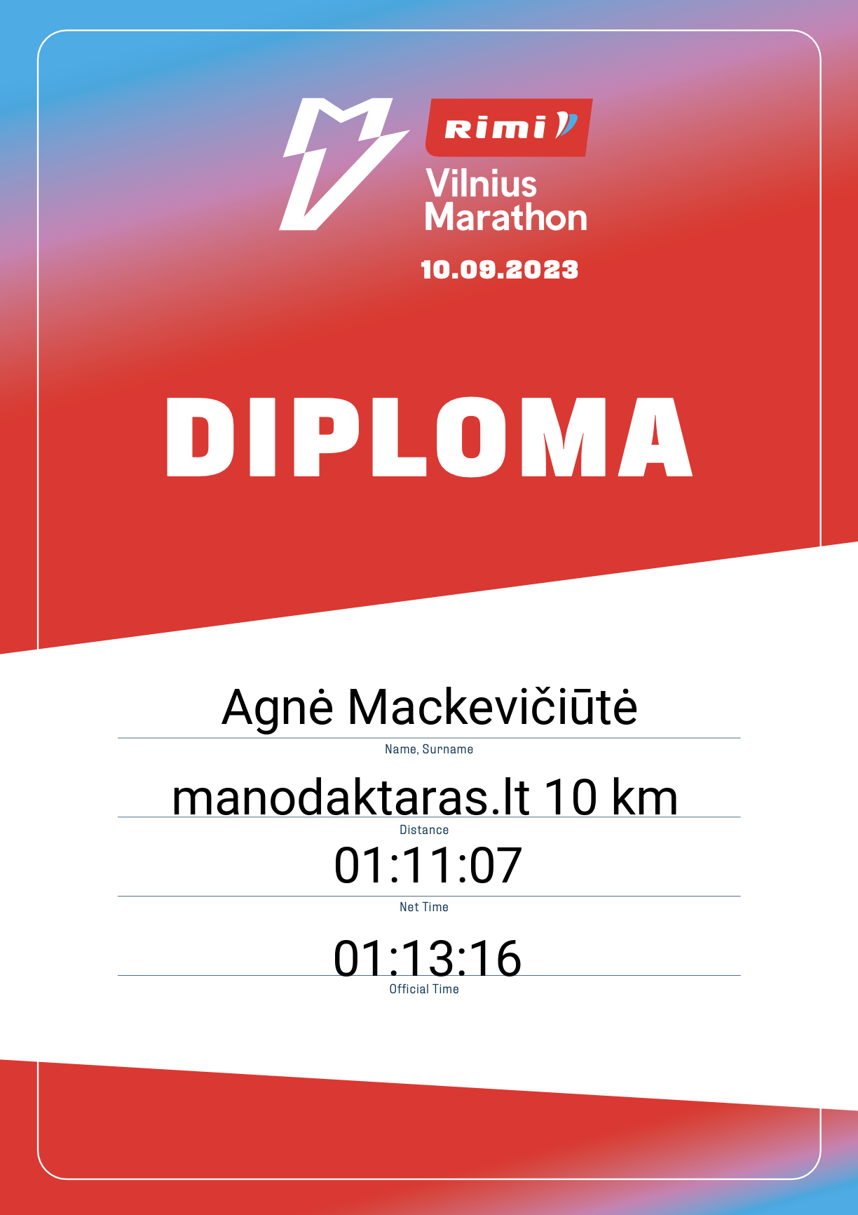 | 1817 | Agnė Mackevičiūtė | 21095 | Lithuania | manodaktaras.lt 10 km | 01:13:16 | Diplomas | |