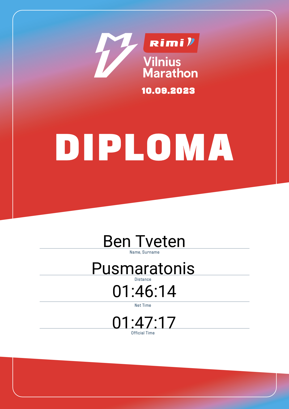 | 703 | Benas Kazlauskas | 12610 | Lithuania | Pusmaratonis | 01:54:42 | Diplomas | |