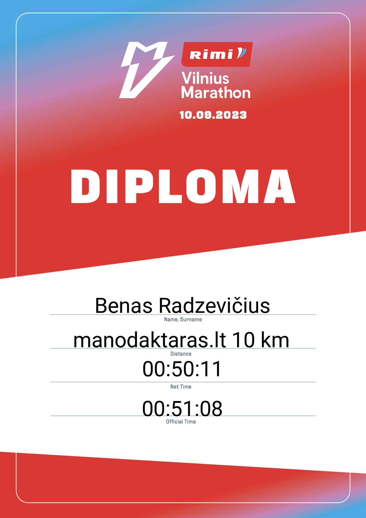 | 313 | Benas Radzevičius | Surfshark | 21957 | Lithuania | manodaktaras.lt 10 km | 00:51:08 | Diplomas |