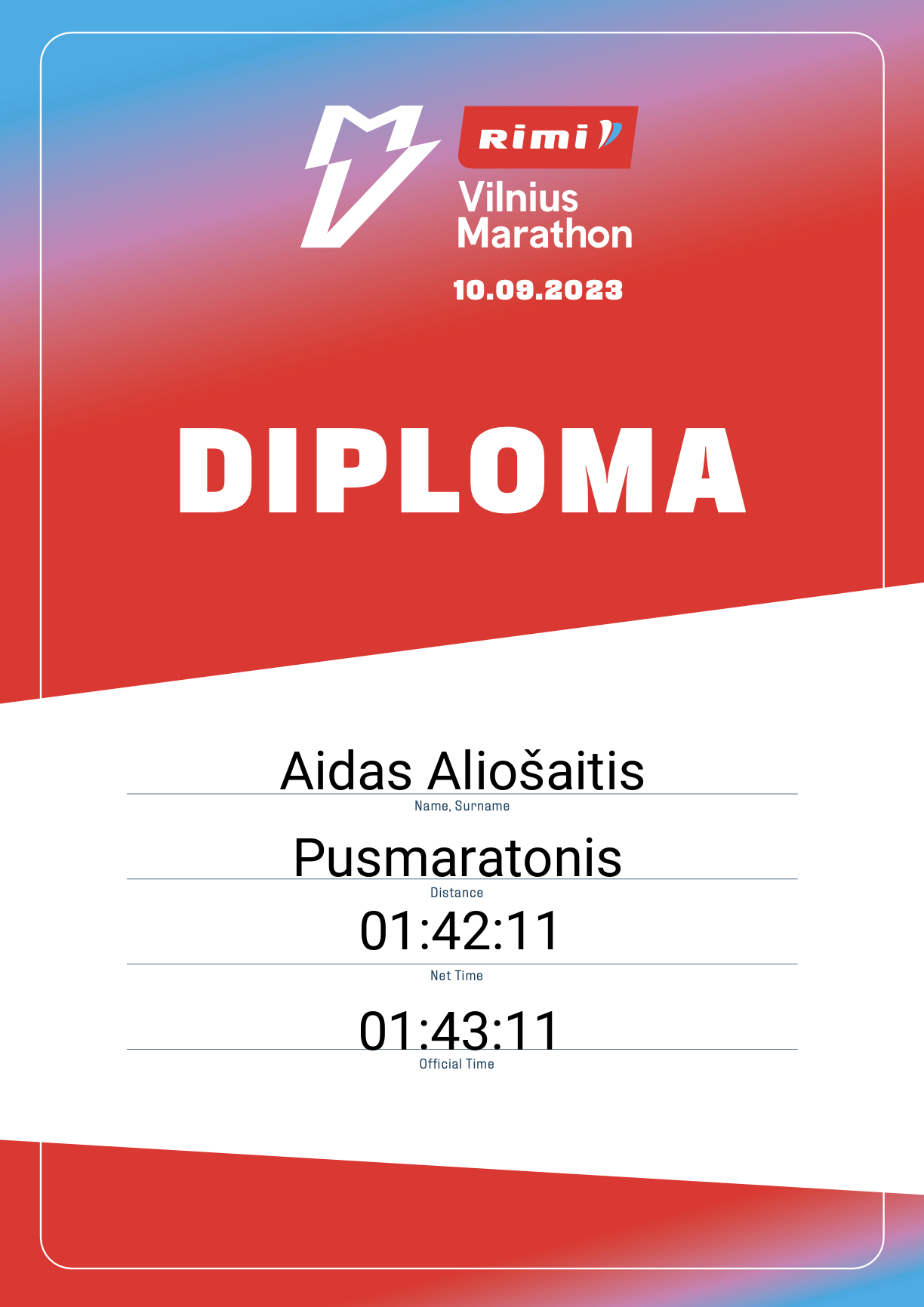 | 327 | Aidas Aliošaitis | 13802 | Lithuania | Pusmaratonis | 01:43:11 | Diplomas | |