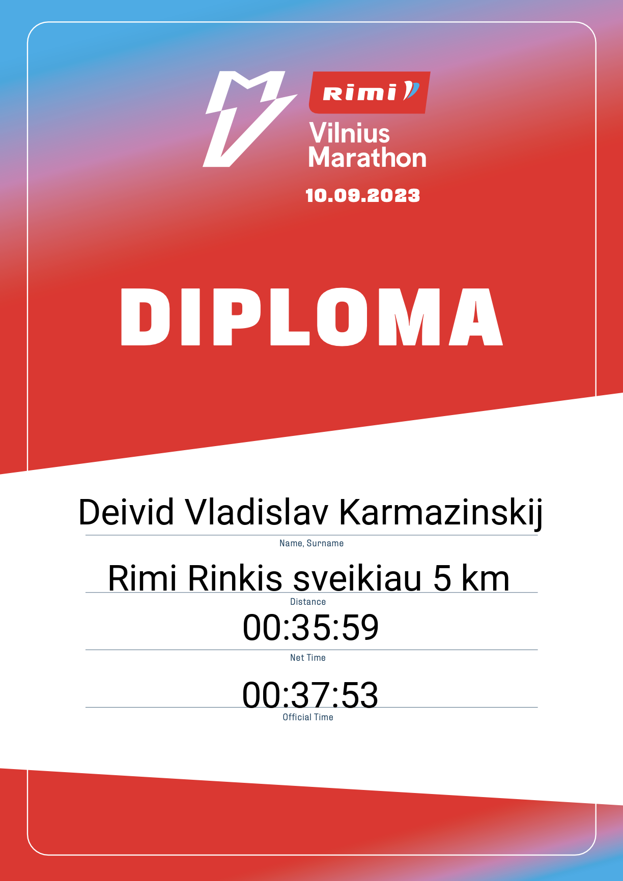 | 1836 | Deivid Vladislav Karmazinskij | Aplenkime vėžį | 33460 | Lithuania | Rimi Rinkis sveikiau 5 km | 00:37:53 | Diplomas |