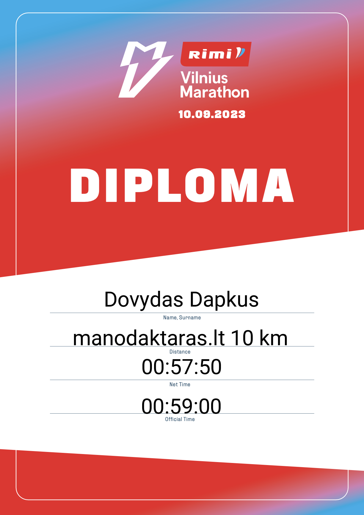 | 896 | Dovis Baltrūnas | 22748 | Lithuania | manodaktaras.lt 10 km | 00:58:50 | Diplomas | |