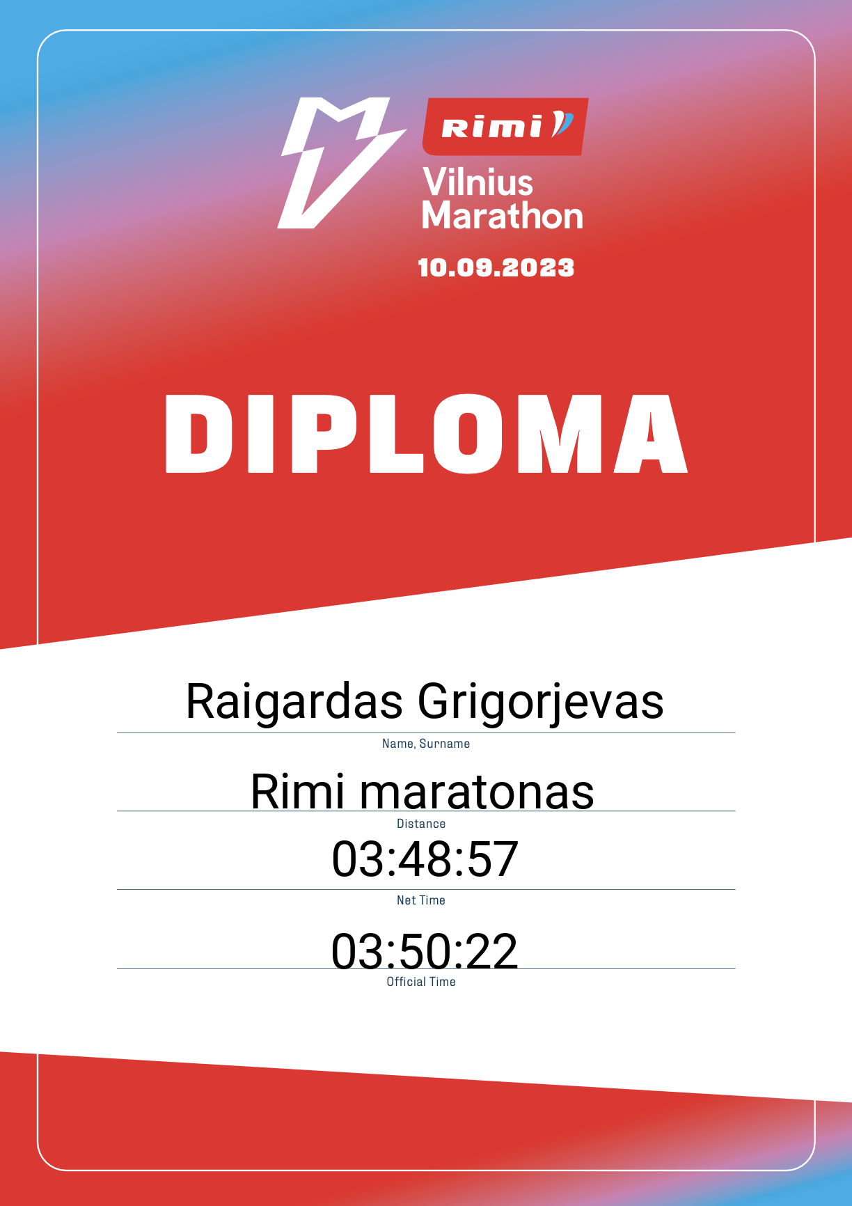 314 Raigardas Grigorjevas 19 Lithuania Rimi maratonas 03:50:22 03:48:57 00:27:40 00:52:56 01:17:59 01:49:21 02:35:11 03:37:17 Diplomas