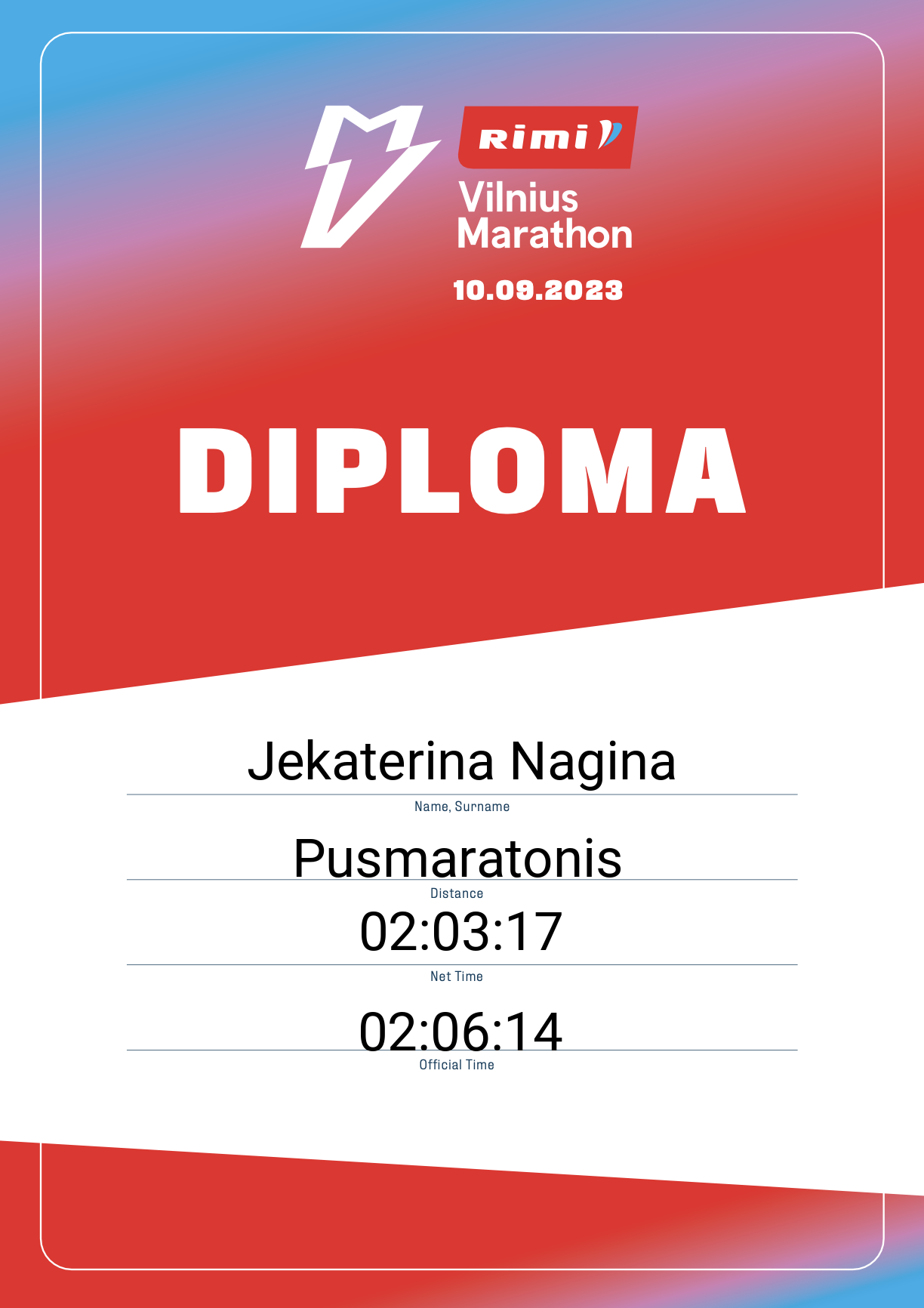 | 1155 | Jekaterina Nagina | Vilnius bėga | 13467 | Lithuania | Pusmaratonis | 02:06:14 | Diplomas |