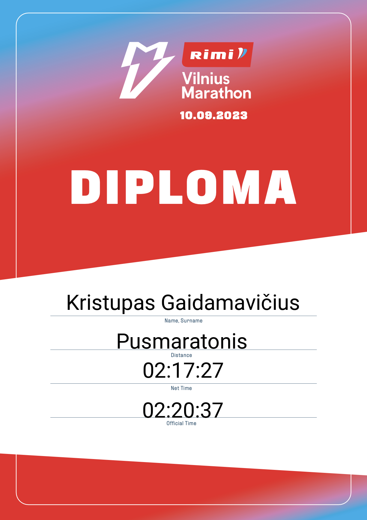 | 1493 | Kristupas Gaidamavičius | 14094 | Lithuania | Pusmaratonis | 02:20:37 | Diplomas | |