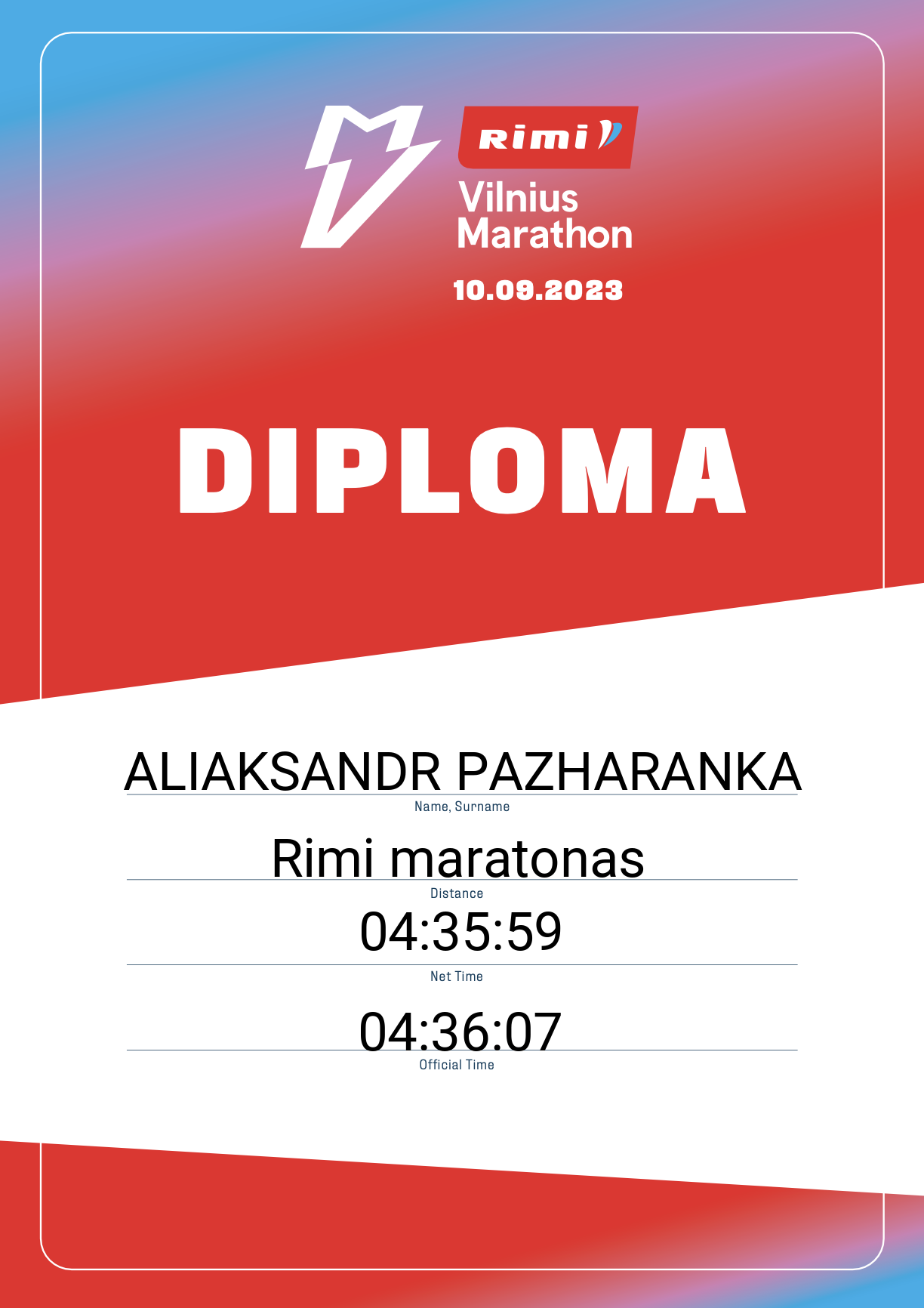 | 709 | ALIAKSANDR PAZHARANKA | 460 | Lithuania | Rimi maratonas | 04:36:07 | Diplomas |