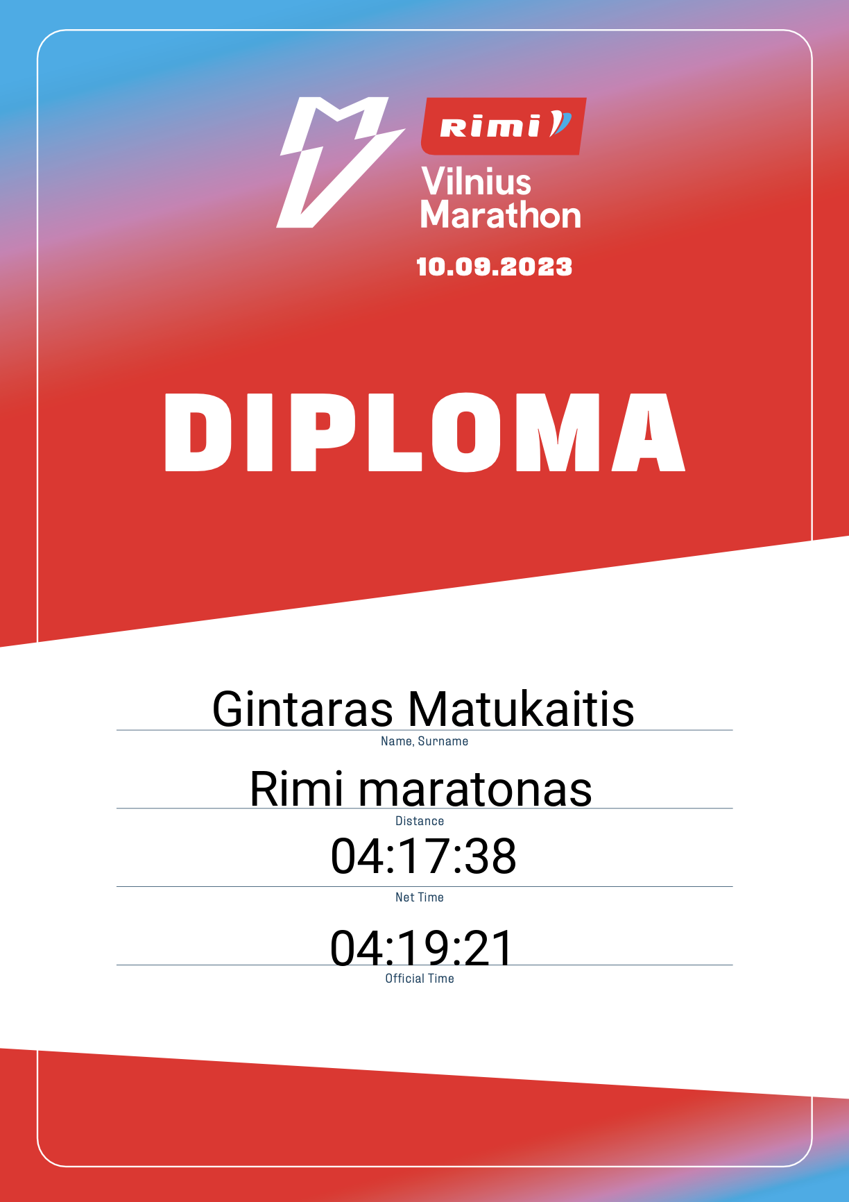 | 862 | Darius Gaižauskis | Žemaitija | 524 | Lithuania | Rimi maratonas | 05:10:03 | Diplomas |