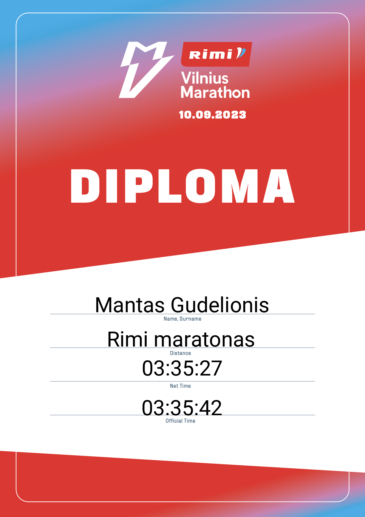 | 152 | Darius Petraška | Vilniaus Bėgimo Klubas | 580 | Lithuania | Rimi maratonas | 03:29:15 | Diplomas |