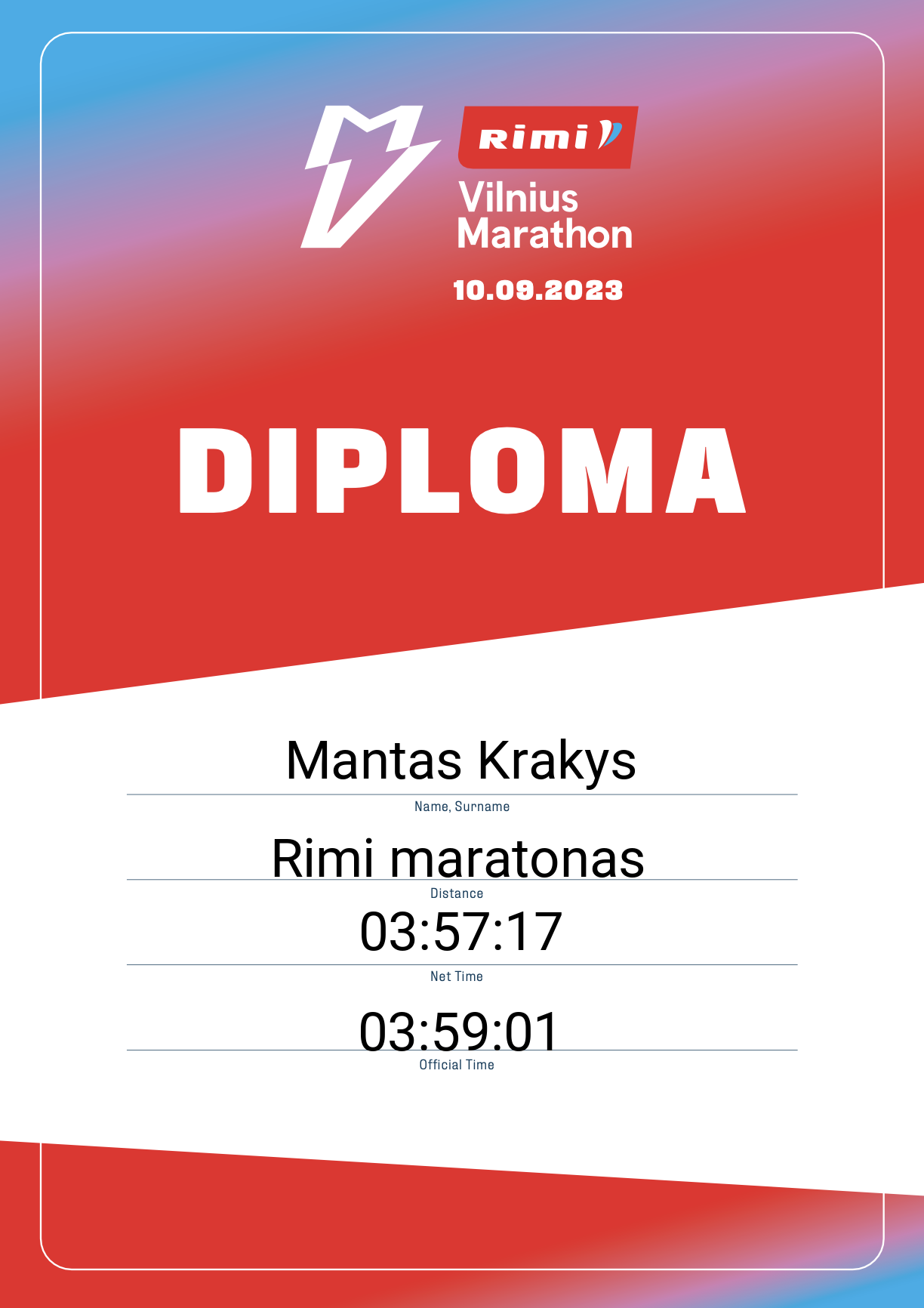 | 422 | Mantas Krakys | 666 | Lithuania | Rimi maratonas | 03:59:01 | Diplomas | |