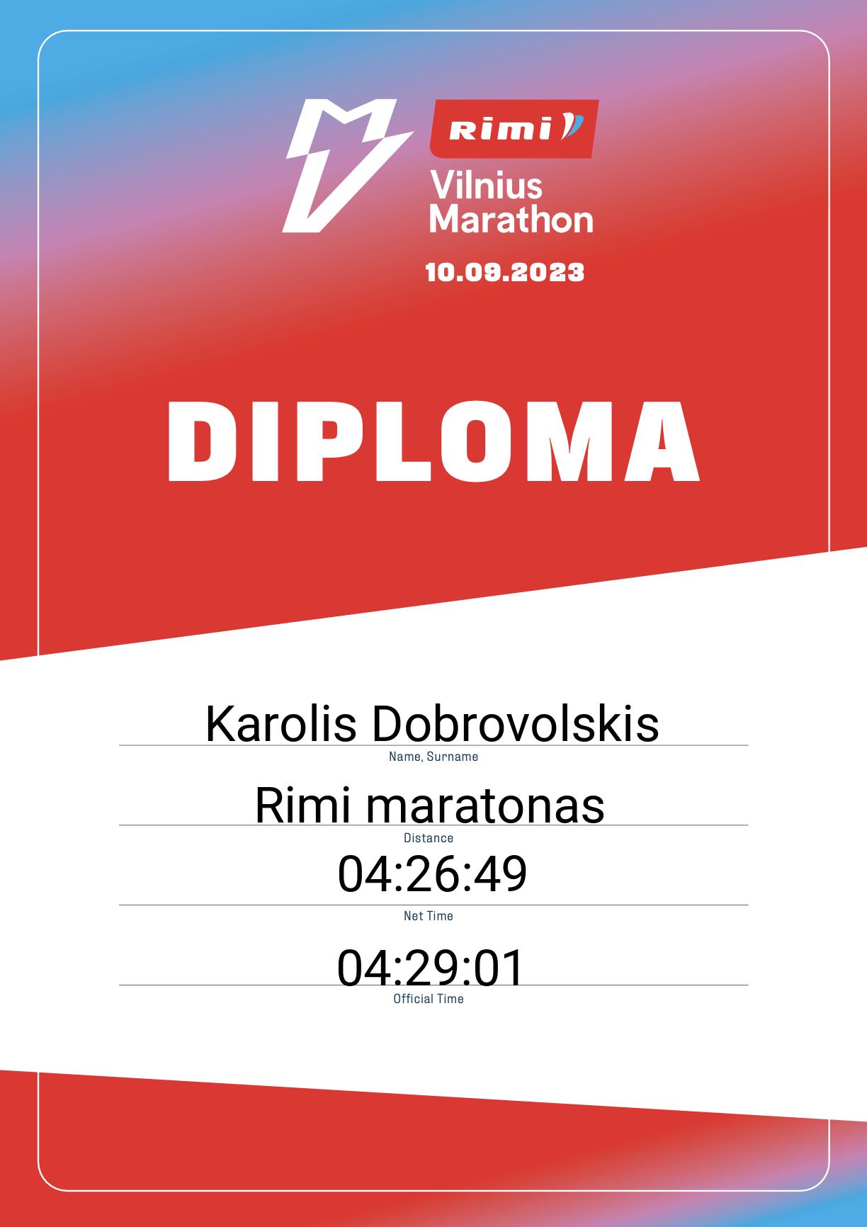 | 649 | Karolis Dobrovolskis | 1090 | Lithuania | Rimi maratonas | 04:29:01 | Diplomas | |