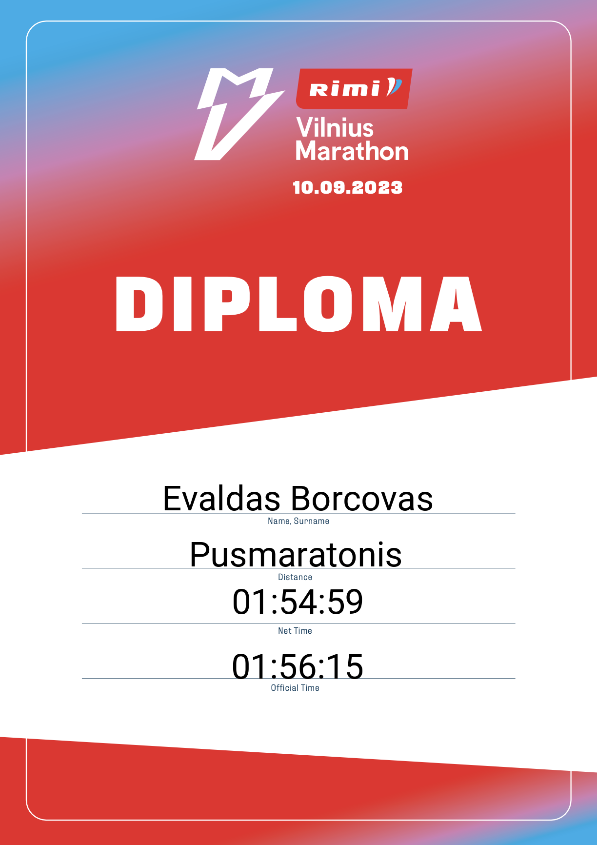 | 47 | Karolis Gečas | Pagėgiai | 12325 | Lithuania | Pusmaratonis | 01:23:31 | Diplomas |