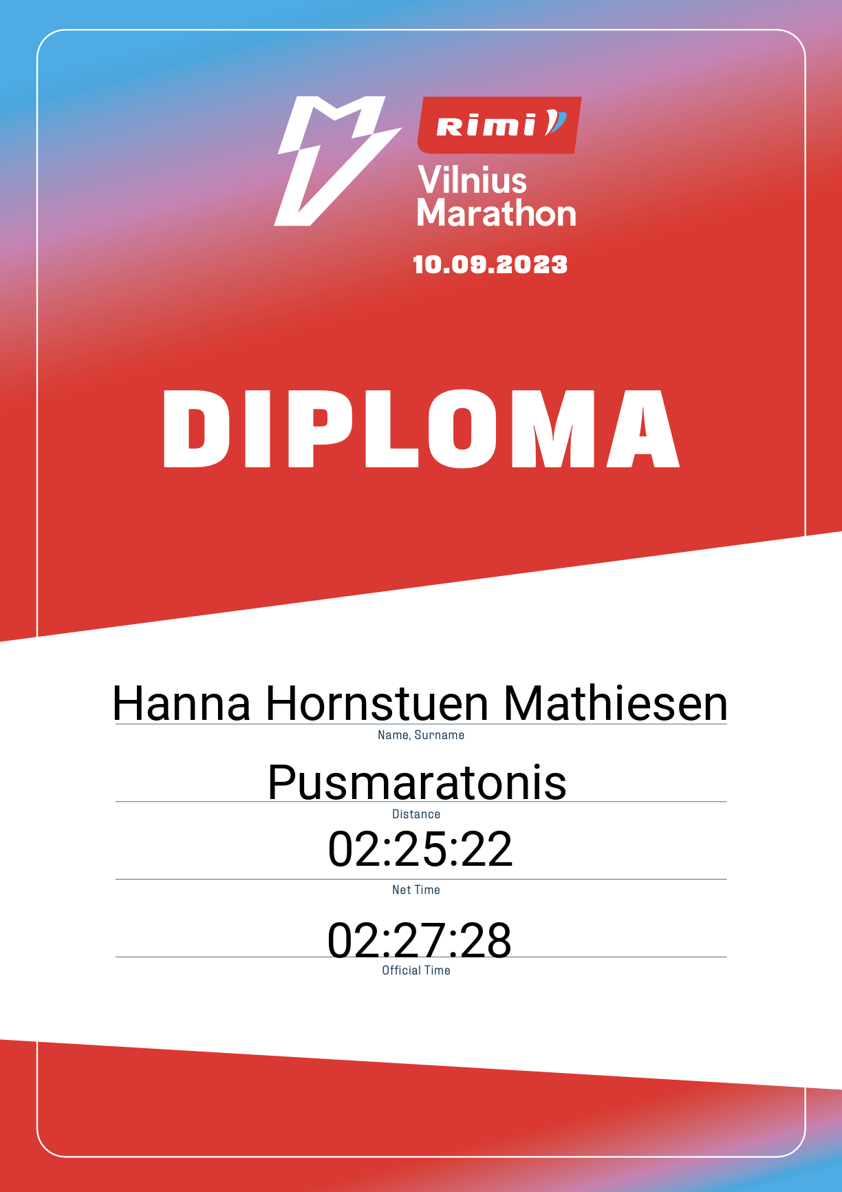 | 703 | Benas Kazlauskas | 12610 | Lithuania | Pusmaratonis | 01:54:42 | Diplomas | |